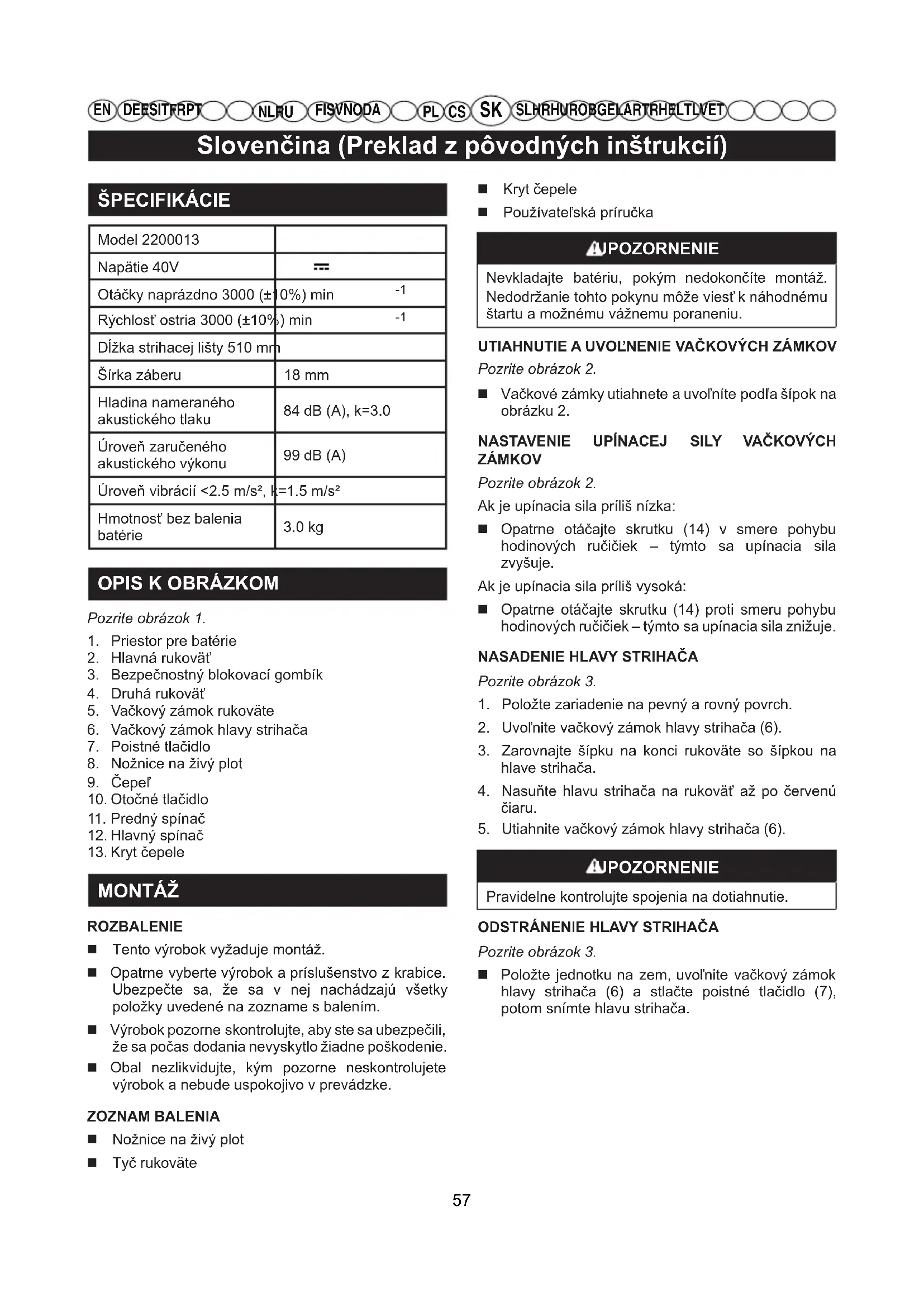 Pozrite obrázok 1.1. Priestor pre batérie2. Hlavná rukoväť3. Bezpečnostný blokovací gombík4. Druhá rukoväť5. Vačkový zámok rukoväte6. Vačkový zámok hlavy strihača7. Poistné tlačidlo8. Nožnice na živý plot9. Čepeľ10. Otočné tlačidlo11. Predný spínač12. Hlavný spínač13. Kryt čepele MONTÁŽ ROZBALENIE Tento výrobok vyžaduje montáž. Opatrne vyberte výrobok a príslušenstvo z krabice. Ubezpečte sa, že sa v nej nachádzajú všetky položky uvedené na zozname s balením. Výrobok pozorne skontrolujte, aby ste sa ubezpečili, že sa počas dodania nevyskytlo žiadne poškodenie. Obal nezlikvidujte, kým pozorne neskontrolujete výrobok a nebude uspokojivo v prevádzke.ZOZNAM BALENIA Nožnice na živý plot Tyč rukoväte Kryt čepele Používateľská príručka UPOZORNENIE Nevkladajte batériu, pokým nedokončíte montáž. Nedodržanie tohto pokynu môže viesť k náhodnému štartu a možnému vážnemu poraneniu.UTIAHNUTIE A UVOĽNENIE VAČKOVÝCH ZÁMKOVPozrite obrázok 2. Vačkové zámky utiahnete a uvoľníte podľa šípok na obrázku 2. NASTAVENIE UPÍNACEJ SILY VAČKOVÝCH ZÁMKOVPozrite obrázok 2.Ak je upínacia sila príliš nízka: Opatrne otáčajte skrutku (14) v smere pohybu hodinových ručičiek – týmto sa upínacia sila zvyšuje.Ak je upínacia sila príliš vysoká: Opatrne otáčajte skrutku (14) proti smeru pohybu hodinových ručičiek – týmto sa upínacia sila znižuje. NASADENIE HLAVY STRIHAČAPozrite obrázok 3.1. Položte zariadenie na pevný a rovný povrch.2. Uvoľnite vačkový zámok hlavy strihača (6).