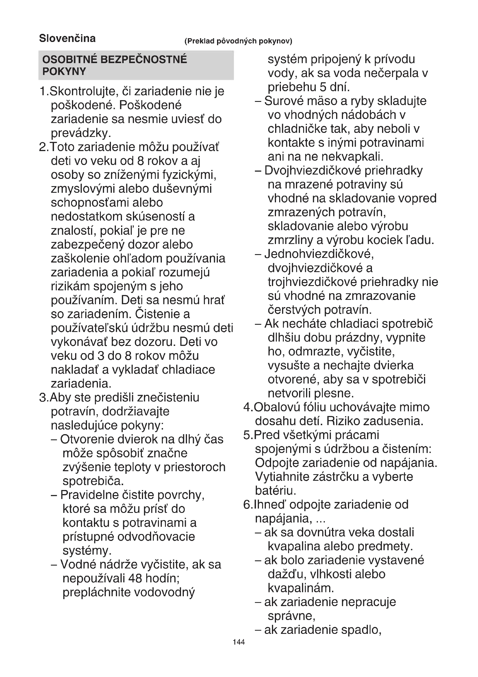 POKYNY 1.Skontrolujte, či zariadenie nie je poškodené. Poškodené zariadenie sa nesmie uviesť do prevádzky. 2.Toto zariadenie môžu používať deti vo veku od 8 rokov a aj osoby so zníženými fyzickými, zmyslovými alebo duševnými schopnosťami alebo nedostatkom skúseností a znalostí, pokiaľ je pre ne zabezpečený dozor alebo zaškolenie ohľadom používania zariadenia a pokiaľ rozumejú rizikám spojeným s jeho používaním. Deti sa nesmú hrať so zariadením. Čistenie a používateľskú údržbu nesmú deti vykonávať bez dozoru. Deti vo veku od 3 do 8 rokov môžu nakladať a vykladať chladiace zariadenia. 3.Aby ste predišli znečisteniu potravín, dodržiavajte nasledujúce pokyny: – Otvorenie dvierok na dlhý čas môže spôsobiť značne zvýšenie teploty v priestoroch spotrebiča. – Pravidelne čistite povrchy, ktoré sa môžu prísť do kontaktu s potravinami a prístupné odvodňovacie systémy. – Vodné nádrže vyčistite, ak sa nepoužívali 48 hodín; prepláchnite vodovodný systém pripojený k prívodu vody, ak sa voda nečerpala v priebehu 5 dní. – Surové mäso a ryby skladujte vo vhodných nádobách v chladničke tak, aby neboli v kontakte s inými potravinami ani na ne nekvapkali. – Dvojhviezdičkové priehradky na mrazené potraviny sú vhodné na skladovanie vopred zmrazených potravín, skladovanie alebo výrobu zmrzliny a výrobu kociek ľadu. – Jednohviezdičkové, dvojhviezdičkové a trojhviezdičkové priehradky nie sú vhodné na zmrazovanie čerstvých potravín. – Ak necháte chladiaci spotrebič dlhšiu dobu prázdny, vypnite ho, odmrazte, vyčistite, vysušte a nechajte dvierka otvorené, aby sa v spotrebiči netvorili plesne. 4.Obalovú fóliu uchovávajte mimo dosahu detí. Riziko zadusenia. 5.Pred všetkými prácami spojenými s údržbou a čistením: Odpojte zariadenie od napájania. Vytiahnite zástrčku a vyberte batériu. 6.Ihneď odpojte zariadenie od napájania, ... – ak sa dovnútra veka dostali kvapalina alebo predmety. – ak bolo zariadenie vystavené dažďu, vlhkosti alebo kvapalinám. – ak zariadenie nepracuje správne, – ak zariadenie spadlo, 2024/03/21 11:56:14Stylesheet: EU Ver 2024.3.12 UL18DF_C99750371_311_EUSlovenčina