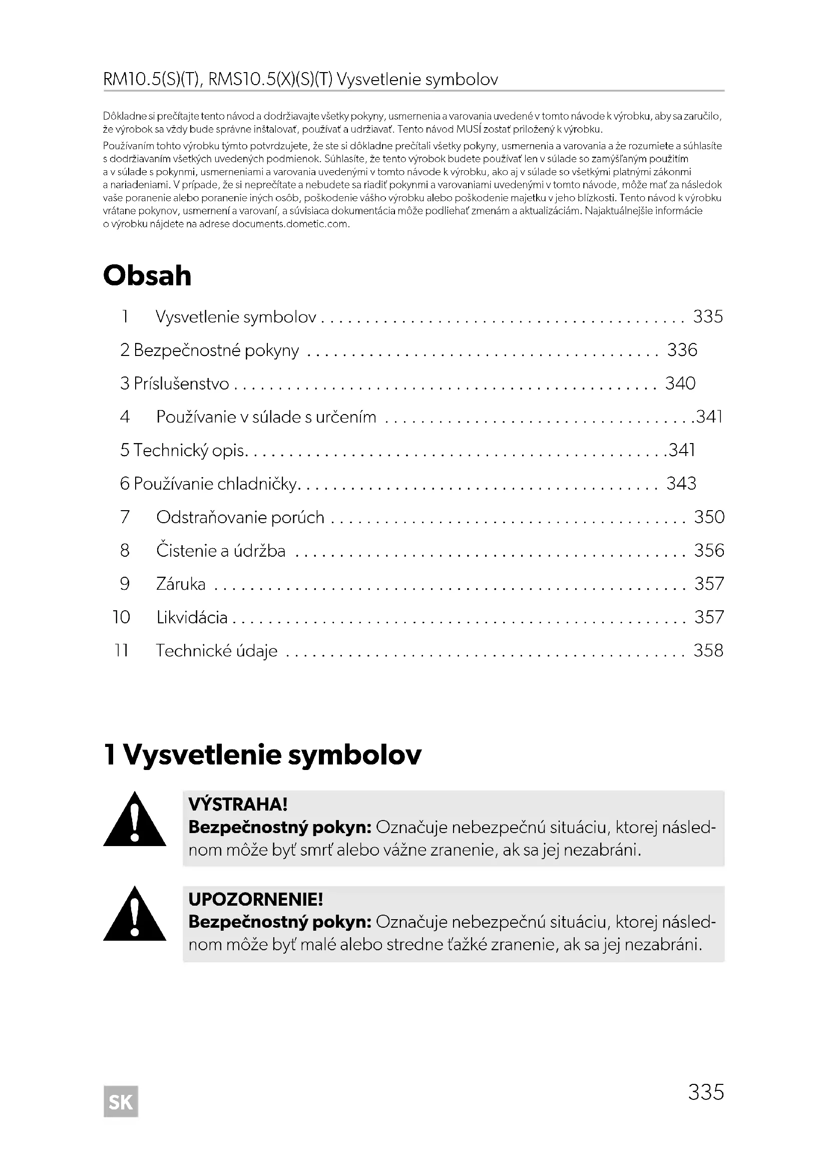 - Dôkladne si prečítajte tento návod a dodržiavajte všetky pokyny, usmernenia a varovania uvedené v tomto návode k výrobku, aby sa zaručilo, že výrobok sa vždy bude správne inštalovať, používať a udržiavať. Tento návod MUSÍ zostať priložený k výrobku. Používaním tohto výrobku týmto potvrdzujete, že ste si dôkladne prečítali všetky pokyny, usmernenia a varovania a že rozumiete a súhlasíte s dodržiavaním všetkých uvedených podmienok. Súhlasíte, že tento výrobok budete používať len v súlade so zamýšľaným použitím a v súlade s pokynmi, usmerneniami a varovania uvedenými v tomto návode k výrobku, ako aj v súlade so všetkými platnými zákonmi a nariadeniami. V prípade, že si neprečítate a nebudete sa riadiť pokynmi a varovaniami uvedenými v tomto návode, môže mať za následok vaše poranenie alebo poranenie iných osôb, poškodenie vášho výrobku alebo poškodenie majetku v jeho blízkosti. Tento návod k výrobku vrátane pokynov, usmernení a varovaní, a súvisiaca dokumentácia môže podliehať zmenám a aktualizáciám. Najaktuálnejšie informácie o výrobku nájdete na adrese documents.dometic.com. Obsah 1 Vysvetlenie symbolov p. 335
