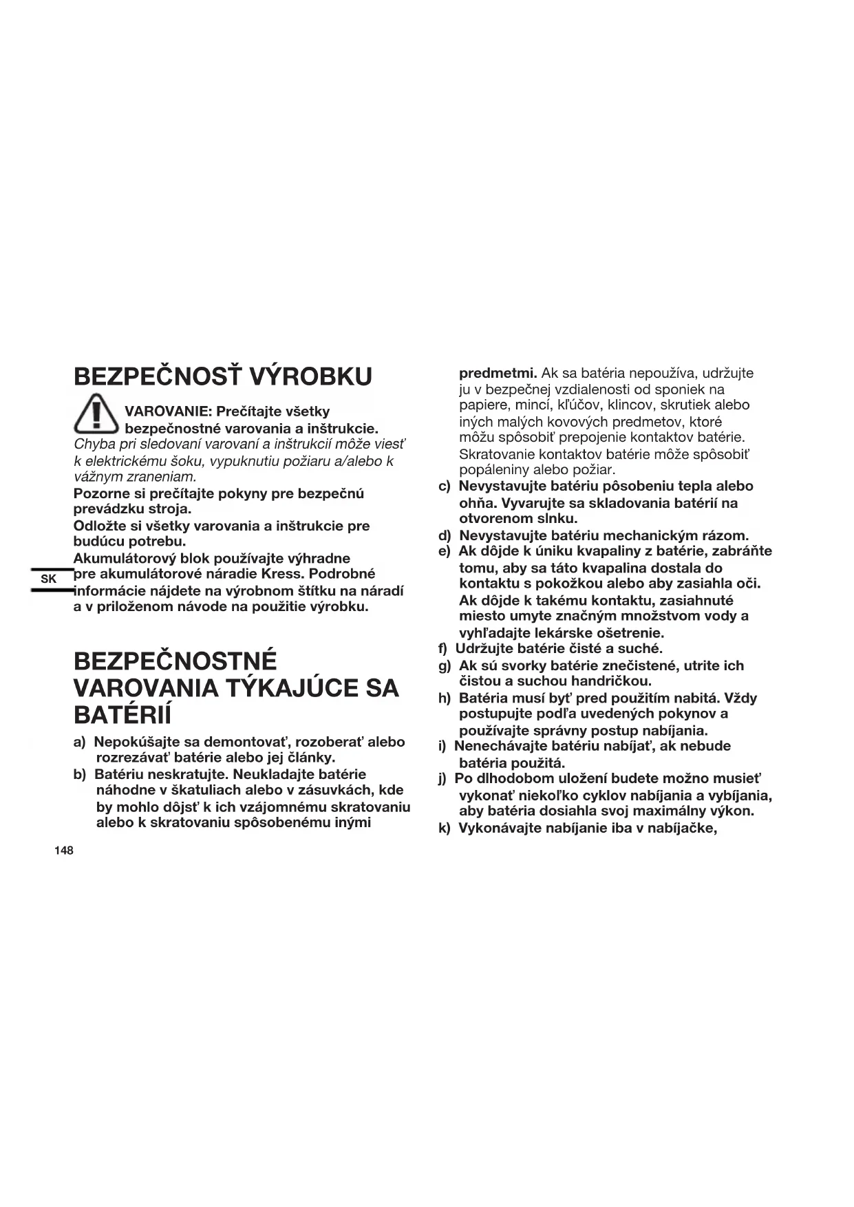 VAROVANIE: Prečítajte všetky bezpečnostné varovania a inštrukcie. Chyba pri sledovaní varovaní a inštrukcií môže viesť k elektrickému šoku, vypuknutiu požiaru a/alebo k vážnym zraneniam. Pozorne si prečítajte pokyny pre bezpečnú prevádzku stroja. Odložte si všetky varovania a inštrukcie pre budúcu potrebu. Akumulátorový blok používajte výhradne pre akumulátorové náradie Kress. Podrobné informácie nájdete na výrobnom štítku na náradí a v priloženom návode na použitie výrobku. BEZPEČNOSTNÉ