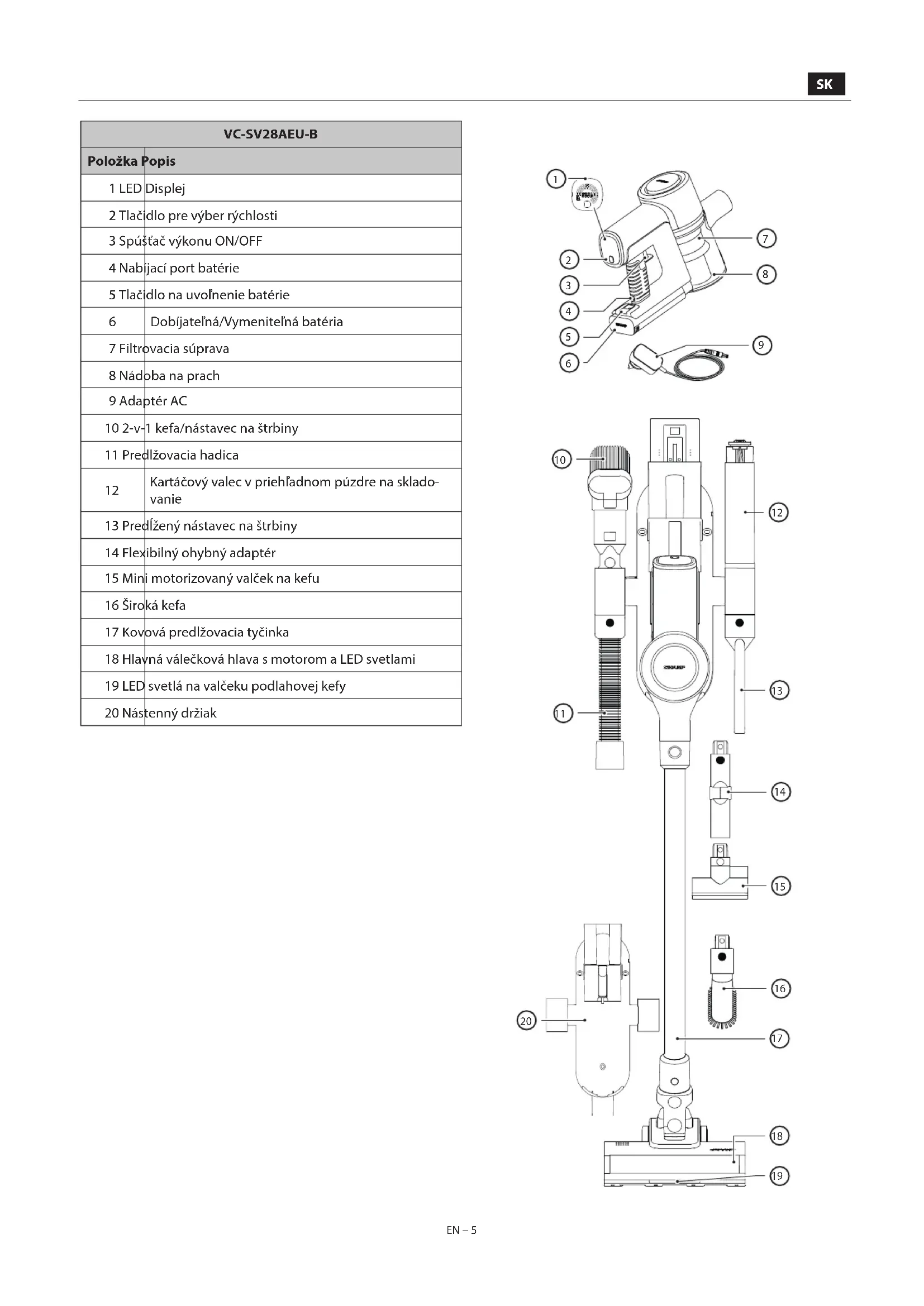SKEN EN – 4 EN – 4 VC-SV20AEU-S Položka Popis 1 LED Displej 2 Tlačidlo pre výber rýchlosti 3 Spúšťač výkonu ON/OFF 4 Nabíjací port batérie 5 Tlačidlo na uvoľnenie batérie 6 Dobíjateľná/Vymeniteľná batéria 7 Filtrovacia súprava 8 Nádoba na prach 9 Adaptér AC 10 2-v-1 kefa/nástavec na štrbiny 11 Flexibilný ohybný adaptér 12 Valček na kefu v skladovacej rúrke 13 Predĺžený nástavec na štrbiny 14 Kovová predlžovacia tyčinka 15 Hlavná válečková hlava s motorom a LED svetlami 16 LED svetlá na valčeku podlahovej kefy 17 Nástenný držiak