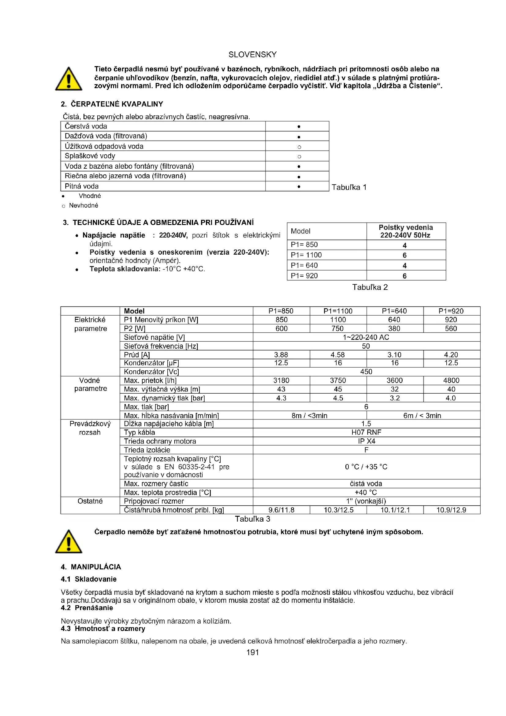 Každá úprava, ktorá nebola autorizovaná predom, zbavuje výrobcu zodpovednosti akéhokoľvek druhu. Všetky náhradné diely používané pri opravách musia byť originálne a všetko príslušenstvo musí byť autorizované výrobcom, aby sa mohla garantovať maximálna bezpečnosť strojov a zariadení, na ktorých môžu byť namontované. Na tento výrobok sa vzťahuje právna záruka (v Európskom spoločenstve na dobu 24 mesiacov od dátumu zakúpenia) na všetky výrobné chyby alebo na použitý materiál. Výrobok v záruke bude možné, na základe nenapadnuteľného rozhodnutia, buď vymeniť za iný v dokonale funkčnom stave alebo bezplatne opraviť, ak boli dodržané nižšie uvedené podmienky: výrobok bol používaný správnym spôsobom, v súlade s návodom, a nebol vykonaný žiadny pokus o opravu kupujúcim alebo treťou stranou; výrobok bol doručený do predajného miesta, v ktorom bol zakúpený, s priložením dokumentu, ktorý potvrdzuje zakúpenie (faktúra alebo účtenka) a krátkym popisom zaznamenaného problému. Záruka sa nevzťahuje na časti vystavené opotrebovaniu, čo je najmä obežné koleso, upchávky a tesnenia.SLOVENŠČINA