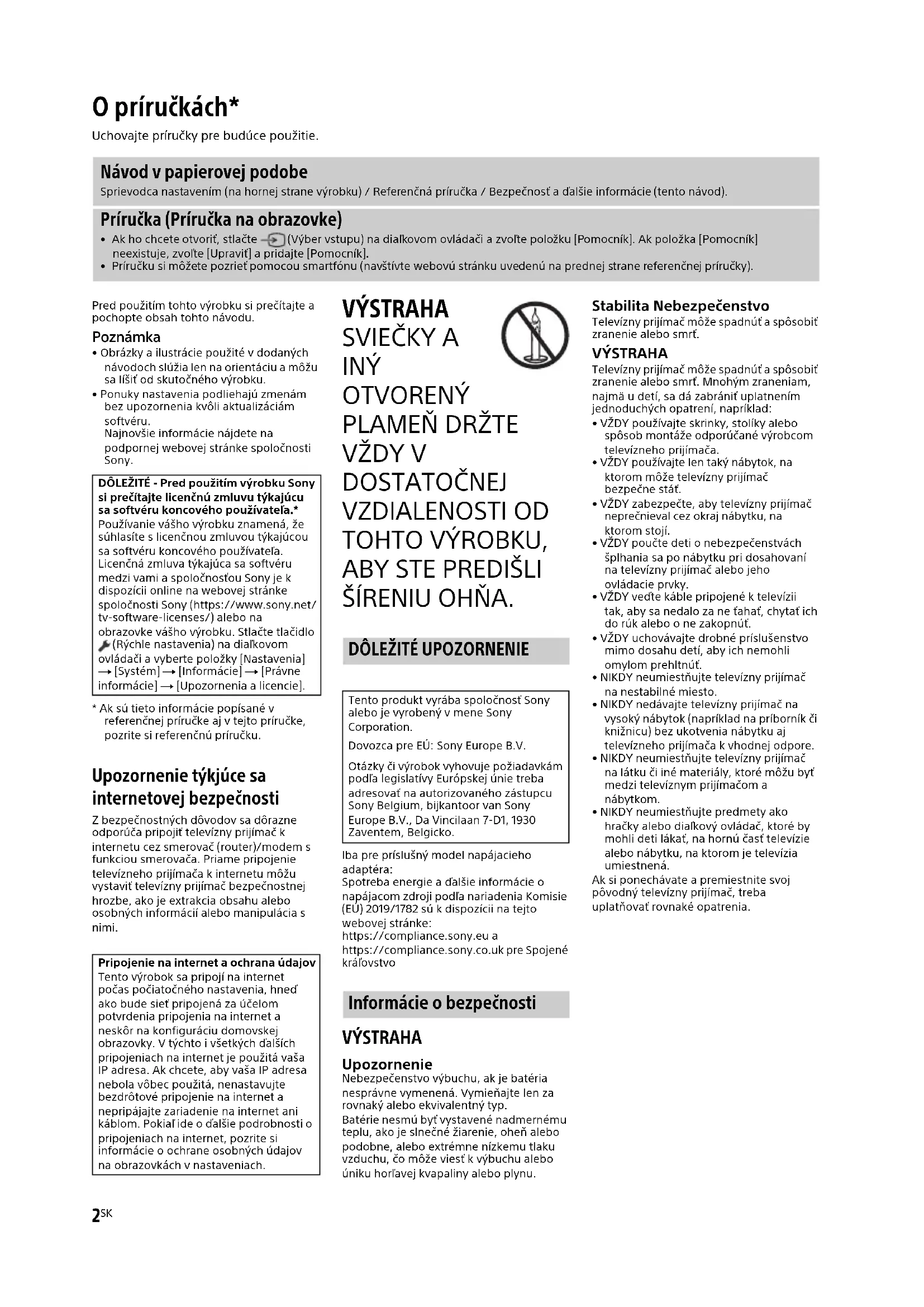 ŠÍRENIU OHŇA. Iba pre príslušný model napájacieho adaptéra:Spotreba energie a ďalšie informácie o napájacom zdroji podľa nariadenia Komisie (EÚ) 2019/1782 sú k dispozícii na tejto webovej stránke:https://compliance.sony.eu ahttps://compliance.sony.co.uk pre Spojené kráľovstvo VÝSTRAHA Upozornenie Nebezpečenstvo výbuchu, ak je batéria nesprávne vymenená. Vymieňajte len za rovnaký alebo ekvivalentný typ.Batérie nesmú byť vystavené nadmernému teplu, ako je slnečné žiarenie, oheň alebo podobne, alebo extrémne nízkemu tlaku vzduchu, čo môže viesť k výbuchu alebo úniku horľavej kvapaliny alebo plynu. Stabilita Nebezpečenstvo Televízny prijímač môže spadnúť a spôsobiť zranenie alebo smrť. VÝSTRAHA Televízny prijímač môže spadnúť a spôsobiť zranenie alebo smrť. Mnohým zraneniam, najmä u detí, sa dá zabrániť uplatnením jednoduchých opatrení, napríklad:• VŽDY používajte skrinky, stolíky alebo spôsob montáže odporúčané výrobcom televízneho prijímača.• VŽDY používajte len taký nábytok, na ktorom môže televízny prijímač bezpečne stáť.• VŽDY zabezpečte, aby televízny prijímač neprečnieval cez okraj nábytku, na ktorom stojí.• VŽDY poučte deti o nebezpečenstvách šplhania sa po nábytku pri dosahovaní na televízny prijímač alebo jeho ovládacie prvky.• VŽDY veďte káble pripojené k televízii tak, aby sa nedalo za ne ťahať, chytať ich do rúk alebo o ne zakopnúť.• VŽDY uchovávajte drobné príslušenstvo mimo dosahu detí, aby ich nemohli omylom prehltnúť.• NIKDY neumiestňujte televízny prijímač na nestabilné miesto.• NIKDY nedávajte televízny prijímač na vysoký nábytok (napríklad na príborník či knižnicu) bez ukotvenia nábytku aj televízneho prijímača k vhodnej odpore.• NIKDY neumiestňujte televízny prijímač na látku či iné materiály, ktoré môžu byť medzi televíznym prijímačom a nábytkom.• NIKDY neumiestňujte predmety ako hračky alebo diaľkový ovládač, ktoré by mohli deti lákať, na hornú časť televízie alebo nábytku, na ktorom je televízia umiestnená.Ak si ponechávate a premiestnite svoj pôvodný televízny prijímač, treba uplatňovať rovnaké opatrenia. O príručkách* Uchovajte príručky pre budúce použitie. Návod v papierovej podobe Sprievodca nastavením (na hornej strane výrobku) / Referenčná príručka / Bezpečnosť a ďalšie informácie (tento návod). Príručka (Príručka na obrazovke)