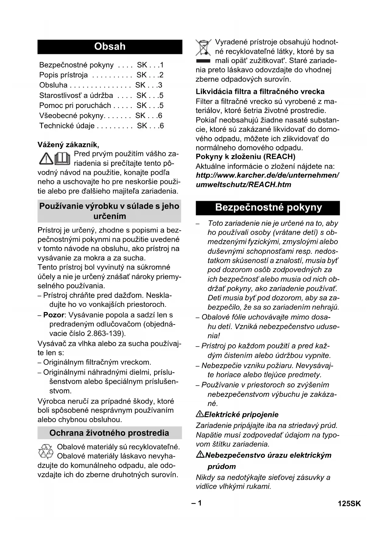 • J 1 123RO– 6 curăţare puneţi capacul la loc şi blocaţi- l (ţinând cont de marcaje şi simboluri). La montare introduceţi mai întâi plutito- rul, apoi aplicaţi coşul şi blocaţi-l. Dacă puterea de aspirare a aparatului sca- de, verificaţi următoarele: Accesoriile, furtunul sau ţevile de aspi- raţie sunt înfundate, în acest caz vă ru- găm să le desfundaţi. Filtrul cu pliuri plate este murdar: În cazul aparatelor fără sistem ExPress de curăţare a filtrului: Scoateţi şi curăţaţi filtrul cu pliuri plate (consultaţi capitolul „Curăţarea filtrului cu pliuri plate”). La aparatele cu sistem de curăţare ExPress: Apăsaţi butonul pentru cură- ţarea filtrului de 3 ori, repetaţi curăţarea cu furtunul de aspiraţie obturat, dacă este nevoie (vezi capitolul „Curăţarea filtrului cu pliuri plate“). Spălaţi filtrul sub apă curentă, dacă este nevoie. Înlocuiţi filtrul cu pliuri plate deteriorat. Sacul de filtrare este plin: Introduceţi sacul de filtrare nou (pt. nr. de comandă vezi lista pieselor de schimb de la sfâr- şitul acestui manual). 몇 Atenţie Nu aruncaţi cadrul sacului de filtrare! În fiecare ţară sunt valabile condiţiile de ga- ranţie publicate de reţeaua noastră de des- facere. Eventuale defecţiuni ale aparatului dumneavoastră, care survin în perioada de garanţie şi care sunt cauzate de defecte de fabricaţie sau de material, se repară în mod gratuit. În cazul producerii unei defecţiuni care se încadrează în garanţie, prezentaţi aparatul, accesoriile şi chitanţa de cumpă- rare la centrul de desfacere sau cea mai apropiată unitate de reparaţii autorizată. (Pentru adresă vedeţi pagina din spate) Dacă aveţi întrebări sau în caz de defecţuni reprezentanţa noastră KÄRCHER vă stă la dispoziţie cu plăcere în continuare. (Pentru adresă vedeţi pagina din spate) O selecţie a pieselor de schimb utilizate cel mai des se găseşte la sfârşitul instrucţiuni- lor de utilizare. Piese de schimb şi accesorii puteţi procura de la comerciant sau de la filiala KÄR- CHER. (Pentru adresă vedeţi pagina din spate) Datele tehnice le găsiţi pe pagina interioa- ră. În continuare vă prezentăm explicaţiile simbolurilor utilizate. Ne rezervăm dreptul de a efectua modi- ficări tehnice ! Puterea de aspirare redusă Observaţii generale Condiţii de garanţie Service-ul autorizat Comandarea pieselor de schimb şi a accesoriilor speciale Date tehnice Tensiunea Puterea P nominal Puterea P max Puterea maximă a prizei Siguranţă pentru reţea (tempori- zată) Volumul rezervorului Consumul de apă cu mâner Consumul de apă cu duză de podea Cablu de reţea Nivelul de zgomot (EN 60704-2-1) Masa (fără accesorii) 124 RO– 1 Vážený zákazník, Pred prvým použitím vášho za- riadenia si prečítajte tento pô- vodný návod na použitie, konajte podľa neho a uschovajte ho pre neskoršie použi- tie alebo pre ďalšieho majiteľa zariadenia. Prístroj je určený, zhodne s popismi a bez- pečnostnými pokynmi na použitie uvedené v tomto návode na obsluhu, ako prístroj na vysávanie za mokra a za sucha. Tento prístroj bol vyvinutý na súkromné účely a nie je určený znášať nároky priemy- selného používania. – Prístroj chráňte pred dažďom. Neskla- dujte ho vo vonkajších priestoroch. – Pozor: Vysávanie popola a sadzí len s predradeným odlučovačom (objedná- vacie číslo 2.863-139). Vysávač za vlhka alebo za sucha používaj- te len s: – Originálnym filtračným vreckom. – Originálnymi náhradnými dielmi, príslu- šenstvom alebo špeciálnym príslušen- stvom. Výrobca neručí za prípadné škody, ktoré boli spôsobené nesprávnym používaním alebo chybnou obsluhou. Obalové materiály sú recyklovateľné. Obalové materiály láskavo nevyha- dzujte do komunálneho odpadu, ale odo- vzdajte ich do zberne druhotných surovín. Vyradené prístroje obsahujú hodnot- né recyklovateľné látky, ktoré by sa mali opät' zužitkovat'. Staré zariade- nia preto láskavo odovzdajte do vhodnej zberne odpadových surovín. Filter a filtračné vrecko sú vyrobené z ma- teriálov, ktoré šetria životné prostredie. Pokiaľ neobsahujú žiadne nasaté substan- cie, ktoré sú zakázané likvidovať do domo- vého odpadu, môžete ich zlikvidovať do normálneho domového odpadu. Pokyny k zloženiu (REACH) Aktuálne informácie o zložení nájdete na: http://www.karcher.de/de/unternehmen/ umweltschutz/REACH.htm – Toto zariadenie nie je určené na to, aby ho používali osoby (vrátane detí) s ob- medzenými fyzickými, zmysloými alebo duševnými schopnosťami resp. nedos- tatkom skúseností a znalostí, musia byť pod dozorom osôb zodpovedných za ich bezpečnosť alebo musia od nich ob- držať pokyny, ako zariadenie používať. Deti musia byť pod dozorom, aby sa za- bezpečilo, že sa so zariadením nehrajú. – Obalové fólie uchovávajte mimo dosa- hu detí. Vzniká nebezpečenstvo uduse- nia! – Prístroj po každom použití a pred kaž- dým čistením alebo údržbou vypnite. – Nebezpečie vzniku požiaru. Nevysávaj- te horiace alebo tlejúce predmety. – Používanie v priestoroch so zvýšením nebezpečenstvom výbuchu je zakáza- né. 몇 Elektrické pripojenie Zariadenie pripájajte iba na striedavý prúd. Napätie musí zodpovedať údajom na typo- vom štítku zariadenia. Nebezpečenstvo úrazu elektrickým prúdom Nikdy sa nedotýkajte sieťovej zásuvky a vidlice vlhkými rukami. Obsah Bezpečnostné pokyny