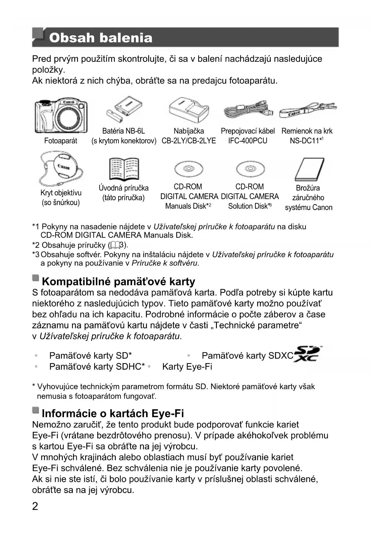Brožúra záručného systému Canon *1 Pokyny na nasadenie nájdete v Užívateľskej príručke k fotoaparátu na disku CD-ROM DIGITAL CAMERA Manuals Disk. *2 Obsahuje príručky (= 3). *3 Obsahuje softvér. Pokyny na inštaláciu nájdete v Užívateľskej príručke k fotoaparátu a pokyny na používanie v Príručke k softvéru. Kompatibilnépamäťovékarty S fotoaparátom sa nedodáva pamäťová karta. Podľa potreby si kúpte kartu niektorého z nasledujúcich typov. Tieto pamäťové karty možno používať bez ohľadu na ich kapacitu. Podrobné informácie o počte záberov a čase záznamu na pamäťovú kartu nájdete v časti „Technické parametre“ v Užívateľskej príručke k fotoaparátu.