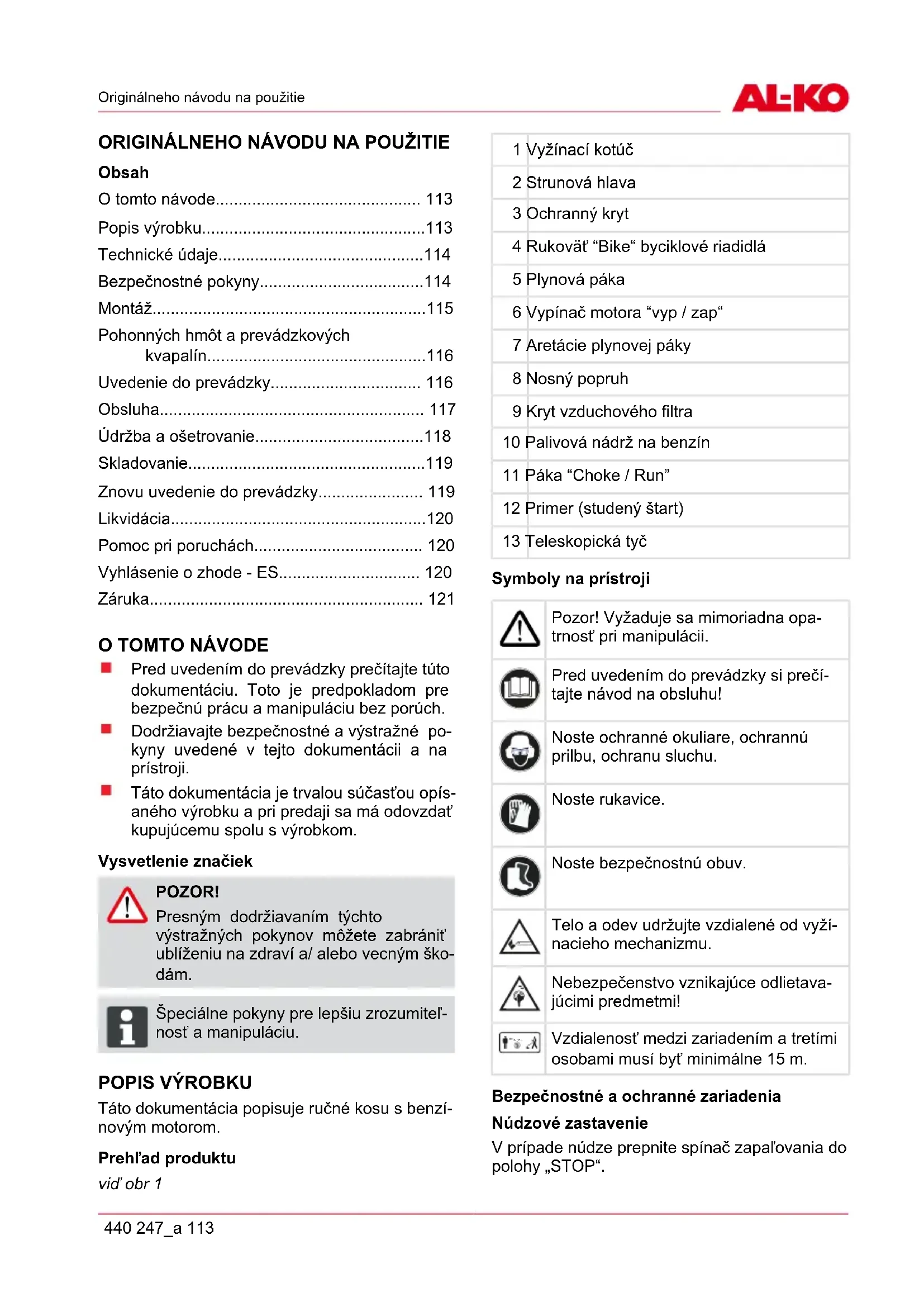 Týmto vyhlasujeme, že tento výrobok v prevedení, ktoré sme uvedli do prevádzky, zodpovedá požia- davkám harmonizovaných smerníc EÚ, bezpečnostných noriem EÚ a noriem platných pre tento výro- bok. Výrobok Výrobca Splnomocnenec Motorový vyžínač, odstre- divou spojkou Typ BC 4535 II AL-KO Geräte GmbH Ichenhauser Str. 14 D-89359 Kötz Anton Eberle Ichenhauser Str. 14 D-89359 Kötz Výrobné číslo Smernice EÚ Harmonizované normy G 230 2305 Kötz, 01.06.2012 2006/42/EG 2004/108/EG 2000/14/EG (13) 2002/88/EG ISO 11806:2009-01 ISO 14982:1998-09 Antonio De Filippo Managing Director Hlučnosť nameraná: 109 dB(A) zaručená: 113 dB(A) Vyhodnotenie zhody 2000 /14/EG príloha VZáruka 440 247_a 121 ZÁRUKA Prípadné materiálové alebo výrobné chyby na zariadení opravíme počas zákonnej doby premlčania pre nároky na chyby podľa našej voľby opravou alebo dodaním náhradných dielov. Doba premlčania sa určuje vždy podľa práva krajiny, v ktorej bolo zariadenie zakúpené. Náš prísľub záruky platí len pri: dodržiavaní tohto návodu na obsluhu odbornej manipulácii používaní originálnych náhradných dielov Záruka zaniká pri: svojvoľných pokusoch o opravu svojvoľných technických zmenách použití v rozpore s určením Zo záruky sú vylúčené: poškodenia laku, ktoré súvisia s normálnym opotrebovaním spotrebné diely, ktoré sú na karte náhradných dielov označené rámikom [xxx xxx (x)] spaľovacie motory (tu platia záručné podmienky príslušného výrobcu motora) Záručná doba začína plynúť od zakúpenia prvým koncovým odberateľom. Rozhodujúci je dátum na doklade o kúpe. S týmto vyhlásením a originálnym dokladom o kúpe sa obráťte na vášho predajcu alebo na najbližšie autorizované pracovisko zákazníckeho servisu. Zákonné nároky na chyby kupujúceho voči predajcovi ostávajú týmto vyhlásením nedotknuté.hu Eredeti használati utasítás 122 BC 4535 II-S
