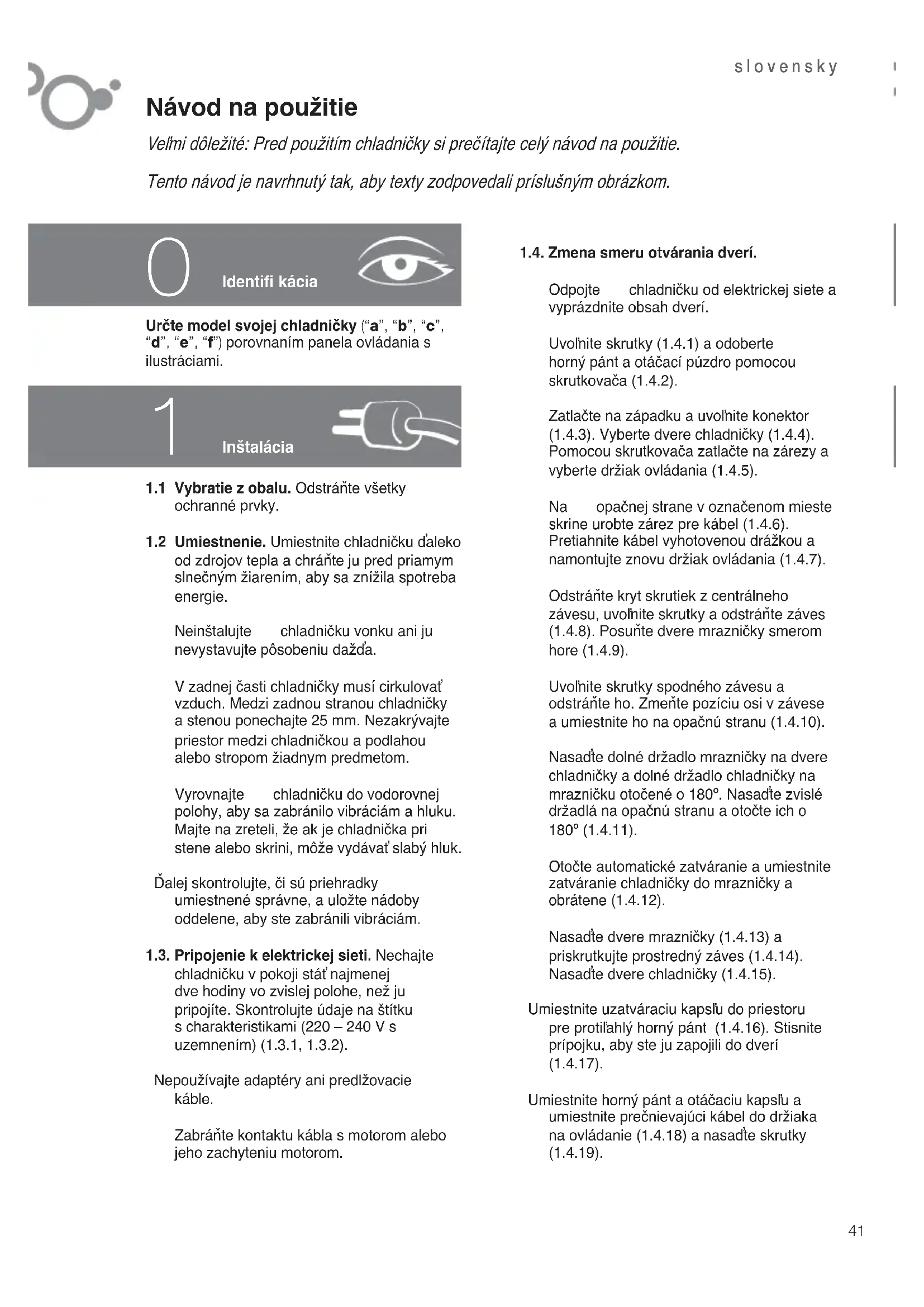 Návod na použitie Veľmi dôležité: Pred použitím chladničky si prečítajte celý návod na použitie. Tento návod je navrhnutý tak, aby texty zodpovedali príslušným obrázkom. Inštalácia Určte model svojej chladničky (“a”, “b”, “c”, “d”, “e”, “f”) porovnaním panela ovládania s ilustráciami.1.1 Vybratie z obalu. Odstráňte všetky ochranné prvky.