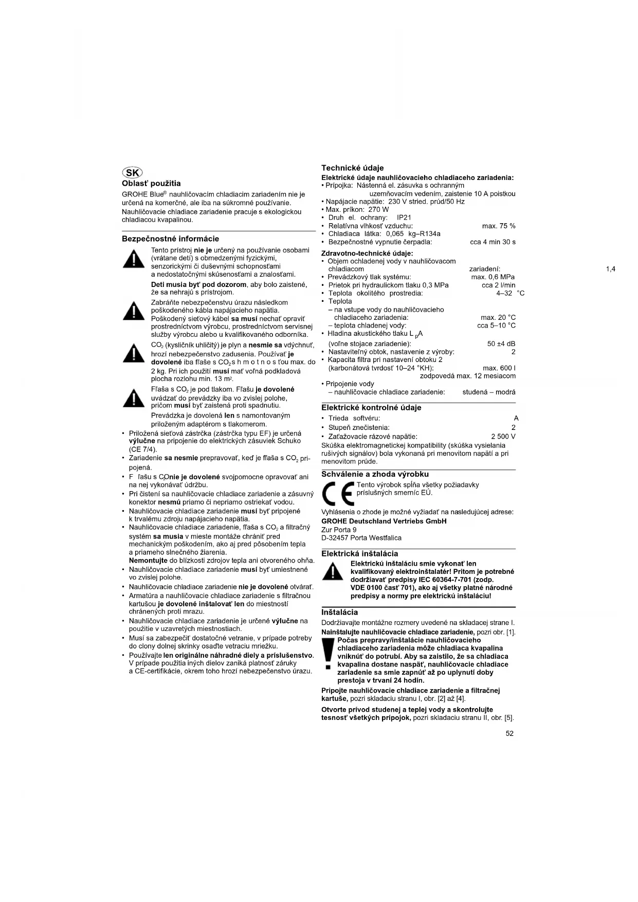 - Zaťažovacie rázové napätie: 2 500 V Skúška elektromagnetickej kompatibility (skúška vysielania rušivých signálov) bola vykonaná pri menovitom napätí a pri menovitom prúde. Schválenie a zhoda výrobku Vyhlásenia o zhode je možné vyžiadať na nasledujúcej adrese: GROHE Deutschland Vertriebs GmbH Zur Porta 9 D-32457 Porta Westfalica Elektrická inštalácia Elektrickú inštaláciu smie vykonať len kvalifikovaný elektroinštalatér! Pritom je potrebné dodržiavať predpisy IEC 60364-7-701 (zodp. VDE 0100 časť 701), ako aj všetky platné národné predpisy a normy pre elektrickú inštaláciu! Inštalácia Dodržiavajte montážne rozmery uvedené na skladacej strane I. Nainštalujte nauhličovacie chladiace zariadenie, pozri obr. [1]. Počas prepravy/inštalácie nauhličovacieho chladiaceho zariadenia môže chladiaca kvapalina vniknúť do potrubí. Aby sa zaistilo, že sa chladiaca kvapalina dostane naspäť, nauhličovacie chladiace zariadenie sa smie zapnúť až po uplynutí doby prestoja v trvaní 24 hodín. Pripojte nauhličovacie chladiace zariadenie a filtračnej kartuše, pozri skladaciu stranu I, obr. [2] až [4]. Otvorte prívod studenej a teplej vody a skontrolujte tesnosť všetkých prípojok, pozri skladaciu stranu II, obr. [5]. Tento výrobok spĺňa všetky požiadavky príslušných smerníc EÚ.53 Pomocou zásuvného spojenia prepojte armatúru s nauhličovacím chladiacim zariadením, pozri obr. [6]. Pripojením sieťovej zástrčky priveďte napájacie napätie, pozri obr. [7]. Rozsvieti sa indikátor na displeji a zobrazí sa zostatková kapacita filtra v percentách. Pripojte fľašu s CO