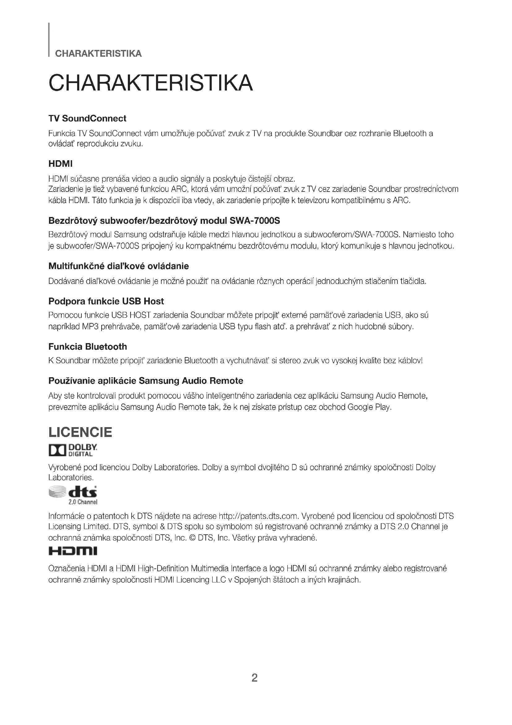 CHARAKTERISTIKA TV SoundConnect Funkcia TV SoundConnect vám umožňuje počúvať zvuk z TV na produkte Soundbar cez rozhranie Bluetooth a ovládať reprodukciu zvuku. HDMI HDMI súčasne prenáša video a audio signály a poskytuje čistejší obraz. Zariadenie je tiež vybavené funkciou ARC, ktorá vám umožní počúvať zvuk z TV cez zariadenie Soundbar prostredníctvom kábla HDMI. Táto funkcia je k dispozícii iba vtedy, ak zariadenie pripojíte k televízoru kompatibilnému s ARC. Bezdrôtový subwoofer/bezdrôtový modul SWA-7000S Bezdrôtový modul Samsung odstraňuje káble medzi hlavnou jednotkou a subwooferom/SWA-7000S. Namiesto toho je subwoofer/SWA-7000S pripojený ku kompaktnému bezdrôtovému modulu, ktorý komunikuje s hlavnou jednotkou. Multifunkčné diaľkové ovládanie Dodávané diaľkové ovládanie je možné použiť na ovládanie rôznych operácií jednoduchým stlačením tlačidla. Podpora funkcie USB Host Pomocou funkcie USB HOST zariadenia Soundbar môžete pripojiť externé pamäťové zariadenia USB, ako sú napríklad MP3 prehrávače, pamäťové zariadenia USB typu flash atď. a prehrávať z nich hudobné súbory. Funkcia Bluetooth K Soundbar môžete pripojiť zariadenie Bluetooth a vychutnávať si stereo zvuk vo vysokej kvalite bez káblov! Používanie aplikácie Samsung Audio Remote Aby ste kontrolovali produkt pomocou vášho inteligentného zariadenia cez aplikáciu Samsung Audio Remote, prevezmite aplikáciu Samsung Audio Remote tak, že k nej získate prístup cez obchod Google Play. LICENCIE Vyrobené pod licenciou Dolby Laboratories. Dolby a symbol dvojitého D sú ochranné známky spoločnosti Dolby Laboratories. Informácie o patentoch k DTS nájdete na adrese http://patents.dts.com. Vyrobené pod licenciou od spoločnosti DTS Licensing Limited. DTS, symbol & DTS spolu so symbolom sú registrované ochranné známky a DTS 2.0 Channel je ochranná známka spoločnosti DTS, Inc. © DTS, Inc. Všetky práva vyhradené. Označenia HDMI a HDMI High-Definition Multimedia Interface a logo HDMI sú ochranné známky alebo registrované ochranné známky spoločnosti HDMI Licencing LLC v Spojených štátoch a iných krajinách.2