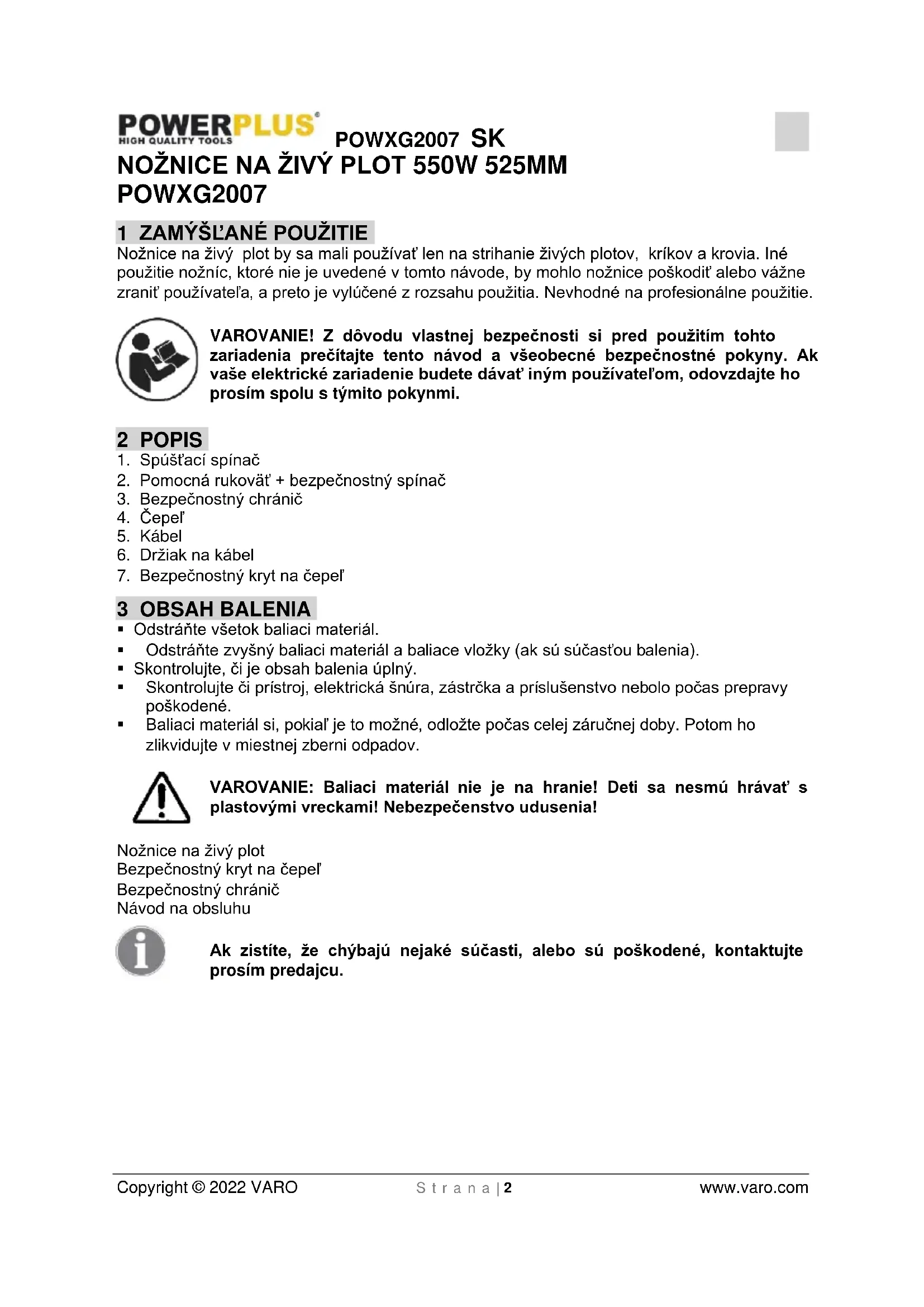 - Varovanie! Kovové prekážky ako ploty atď. môžu poškodiť rezacie čepele.POWXG2007 SK Copyright © 2022 VARO S t r a n a | 6 www.varo.com
