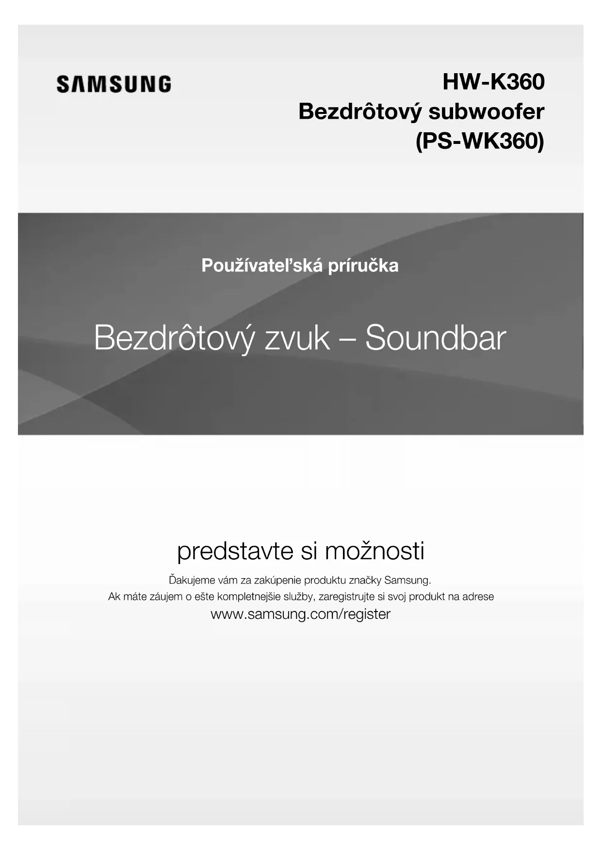www.samsung.com/bg/support ROMANIA *8000 (apel in retea) 08008-726-78-64 (08008-SAMSUNG) Apel GRATUIT www.samsung.com/ro/support CYPRUS 8009 4000 only from landline, toll free www.samsung.com/gr/support GREECE 80111-SAMSUNG (80111 726 7864) only from land line (+30) 210 6897691 from mobile and land line LITHUANIA 8-800-77777 www.samsung.com/lt/support LATVIA 8000-7267 www.samsung.com/lv/support ESTONIA 800-7267 www.samsung.com/ee/supportBezdrôtový zvuk – Soundbar predstavte si možnosti Ďakujeme vám za zakúpenie produktu značky Samsung.Ak máte záujem o ešte kompletnejšie služby, zaregistrujte si svoj produkt na adrese www.samsung.com/register Používateľská príručka HW-K360 Bezdrôtový subwoofer (PS-WK360)2 ZAČÍNAME FUNKCIE Aplikácia Samsung Remote Do dlane ruky uchopte ovládanie zariadenia Soundbar s inteligentným zariadením so systémom Android a aplikáciou Samsung Audio Remote. Táto pohodlná aplikácia vám umožňuje ovládať všetky základné funkcie zariadenia Soundbar, ako je ovládanie zapínania, hlasitosti a médií a umožňuje vám ovládať prispôsobiteľné funkcie, ako napríklad ekvalizér. Rozšírenie priestorového zvuku Funkcia Surround Sound Expansion (Rozšírenie priestorového zvuku) pridá do zvukového prednesu hĺbku a priestorovosť. TV SoundConnect Zvuk z TV počúvajte cez modul Soundbar prepojením TV s modulom Soundbar cez Bluetooth pomocou funkcie SoundConnect. Jednoduchá konektivita a neprítomnosť zhluku káblov medzi zariadením Soundbar a TV vám umožní predviesť tenký a elegantný dizajn obidvoch systémov, zatiaľ čo zachováte čistý vzhľad vo vašom obytnom prostredí. Jednoducho ovládajte zariadenie Soundbar a TV z jedného diaľkového ovládania TV. Podpora USB hostiteľa Pomocou funkcie USB HOST zariadenia Soundbar môžete pripojiť externé pamäťové zariadenia USB typu Flash, ako sú napríklad MP3 prehrávače, pamäťové kľúče USB typu flash atď. a prehrávať z nich hudobné súbory. Funkcia Bluetooth K zariadeniu Soundbar môžete pripojiť zariadenie Bluetooth a vychutnávať si hudbu so stereo zvukom vo vysokej kvalite bez káblov! LICENCIE Manufactured under license from Dolby Laboratories. Dolby, Dolby Audio, Pro Logic, and the double-D symbol are trademarks of Dolby Laboratories. For DTS patents, see http://patents.dts.com. Manufactured under license from DTS Licensing Limited. DTS, the Symbol, DTS in combination with the Symbol, and DTS 2.0 Channel are registered trademarks or trademarks of DTS, Inc. in the United States and/or other countries. © DTS, Inc. All Rights Reserved.SK