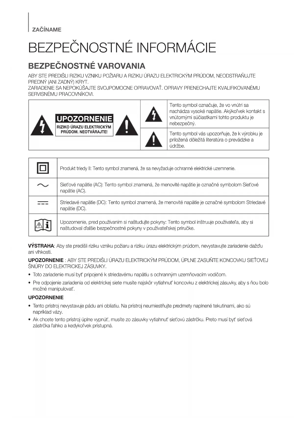 ABY STE PREDIŠLI RIZIKU VZNIKU POŽIARU A RIZIKU ÚRAZU ELEKTRICKÝM PRÚDOM, NEODSTRAŇUJTE PREDNÝ (ANI ZADNÝ) KRYT. ZARIADENIE SA NEPOKÚŠAJTE SVOJPOMOCNE OPRAVOVAŤ. OPRAVY PRENECHAJTE KVALIFIKOVANÉMU SERVISNÉMU PRACOVNÍKOVI. UPOZORNENIE RIZIKO ÚRAZU ELEKTRICKÝM PRÚDOM. NEOTVÁRAJTE!Tento symbol označuje, že vo vnútri sa nachádza vysoké napätie. Akýkoľvek kontakt s vnútornými súčiastkami tohto produktu je nebezpečný.Tento symbol vás upozorňuje, že k výrobku je priložená dôležitá literatúra o prevádzke a údržbe.Produkt triedy II: Tento symbol znamená, že sa nevyžaduje ochranné elektrické uzemnenie.Sieťové napätie (AC): Tento symbol znamená, že menovité napätie je označné symbolom Sieťové napätie (AC).Striedavé napätie (DC): Tento symbol znamená, že menovité napätie je označné symbolom Striedavé napätie (DC).Upozornenie, pred používaním si naštudujte pokyny: Tento symbol inštruuje používateľa, aby si naštudoval ďalšie bezpečnostné pokyny v používateľskej príručke. VÝSTRAHA: Aby ste predišli riziku vzniku požiaru a riziku úrazu elektrickým prúdom, nevystavujte zariadenie dažďu ani vlhkosti.UPOZORNENIE : ABY STE PREDIŠLI ÚRAZU ELEKTRICKÝM PRÚDOM, ÚPLNE ZASUŇTE KONCOVKU SIEŤOVEJ ŠNÚRY DO ELEKTRICKEJ ZÁSUVKY.