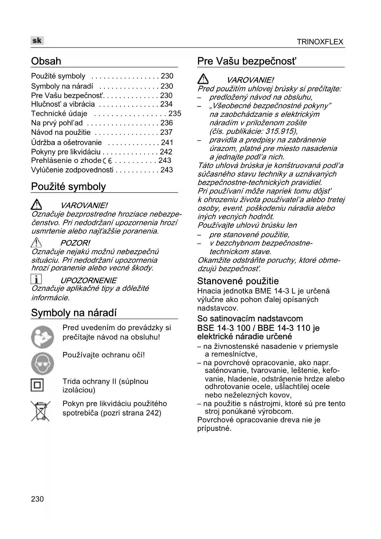 v bezchybnom bezpečnostne- technickom stave. Okamžite odstráňte poruchy, ktoré obme- dzujú bezpečnosť. Stanovené použitie Hnacia jednotka BME 14-3 L je určená výlučne ako pohon ďalej opísaných nadstavcov. So satinovacím nadstavcom BSE 14-3 100 / BBE 14-3 110 je elektrické náradie určené – na živnostenské nasadenie v priemysle a remeslníctve, – na povrchové opracovanie, ako napr. saténovanie, tvarovanie, leštenie, kefo- vanie, hladenie, odstránenie hrdze alebo odhrotovanie ocele, ušľachtilej ocele nebo neželezných kovov, – na použitie s nástrojmi, ktoré sú pre tento stroj ponúkané výrobcom. Povrchové opracovanie dreva nie je prípustné.TRINOXFLEX