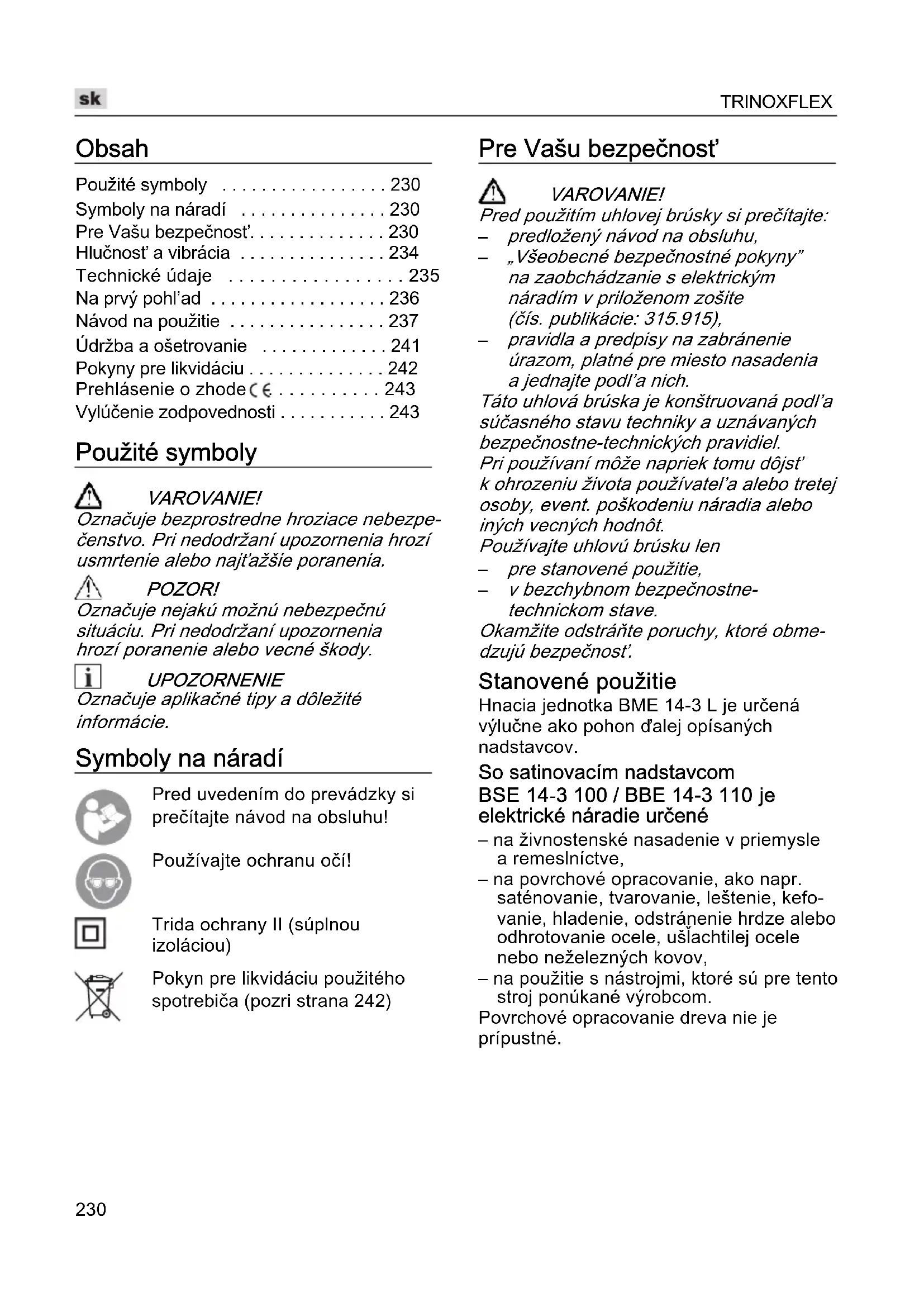 v bezchybnom bezpečnostne- technickom stave. Okamžite odstráňte poruchy, ktoré obme- dzujú bezpečnosť. Stanovené použitie Hnacia jednotka BME 14-3 L je určená výlučne ako pohon ďalej opísaných nadstavcov. So satinovacím nadstavcom BSE 14-3 100 / BBE 14-3 110 je elektrické náradie určené – na živnostenské nasadenie v priemysle a remeslníctve, – na povrchové opracovanie, ako napr. saténovanie, tvarovanie, leštenie, kefo- vanie, hladenie, odstránenie hrdze alebo odhrotovanie ocele, ušľachtilej ocele nebo neželezných kovov, – na použitie s nástrojmi, ktoré sú pre tento stroj ponúkané výrobcom. Povrchové opracovanie dreva nie je prípustné.TRINOXFLEX
