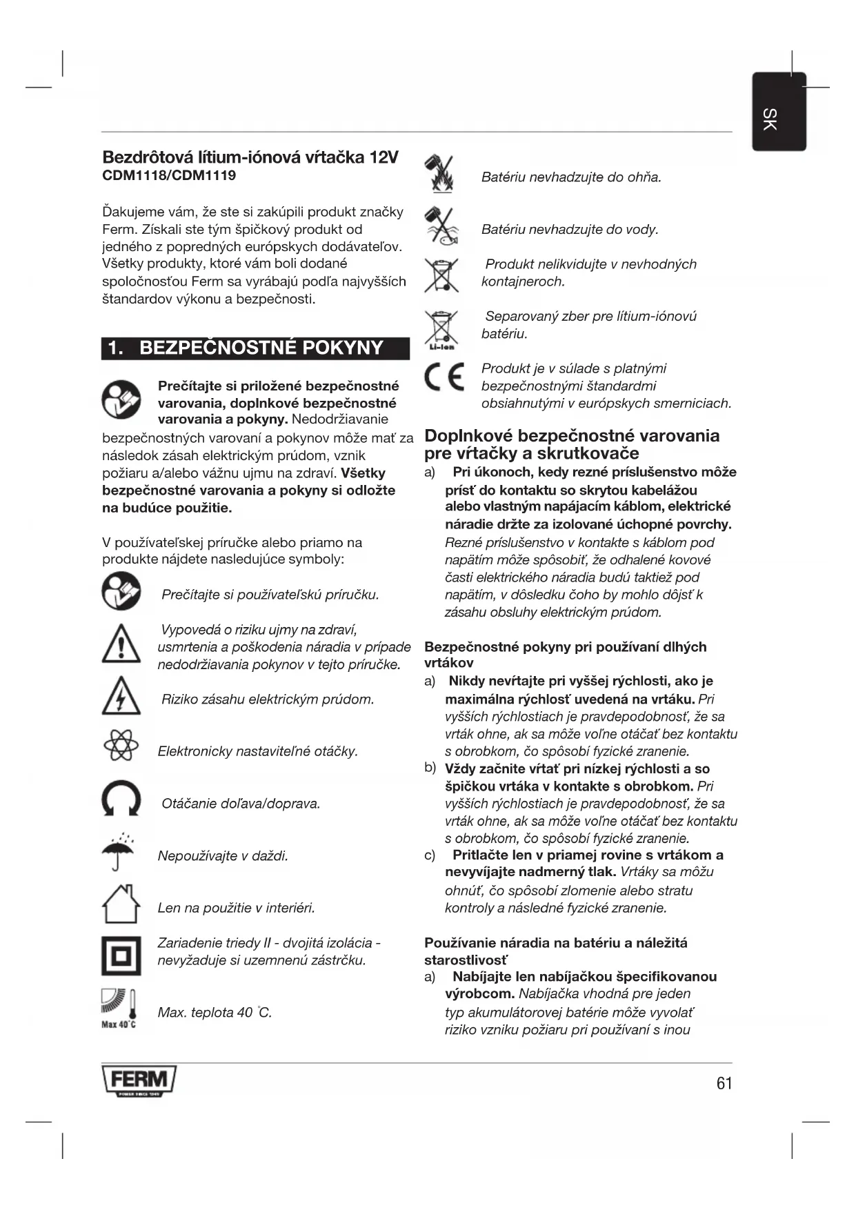 ZÁRUKA Záručnépodmienkynájdetevsamostatne priloženomzáručnomliste. ŽIVOTNÉ PROSTREDIE Chybné alebo vyradené elektrické či elektronické zariadenia musia byť zberané v príslušných recyklačných zberniach. Len pre krajiny ES Elektrickénáradienelikvidujteakosúčasť komunálnehoodpadu.PodľaEurópskejsmernice 2012/19/ESovyradenýchelektrickýcha elektronickýchzariadeniachajejimplementácie do národného práva sa elektrické náradie, ktoré jeviacnepoužiteľné,musízberaťakoseparovaný odpadalikvidovaťekologickýmspôsobom. Produkt a používateľská príručka podliehajú zmenám. Špecifikácie sa môžu zmeniť bez predchádzajúceho upozornenia. Wiertarko-wkrętarka akumulatorowa litowo-jonowa 12 V CDM1118/CDM1119 DziękujemyzazakuptegoproduktuFerm. NabyliściePaństwodoskonałyprodukt, dostarczanyprzezjednegozwiodących dostawców w Europie. Wszystkie produkty dostarczanePaństwuprzezFermsąwytwarzane zgodnieznajwyższymistandardamiwydajnościi bezpieczeństwa.