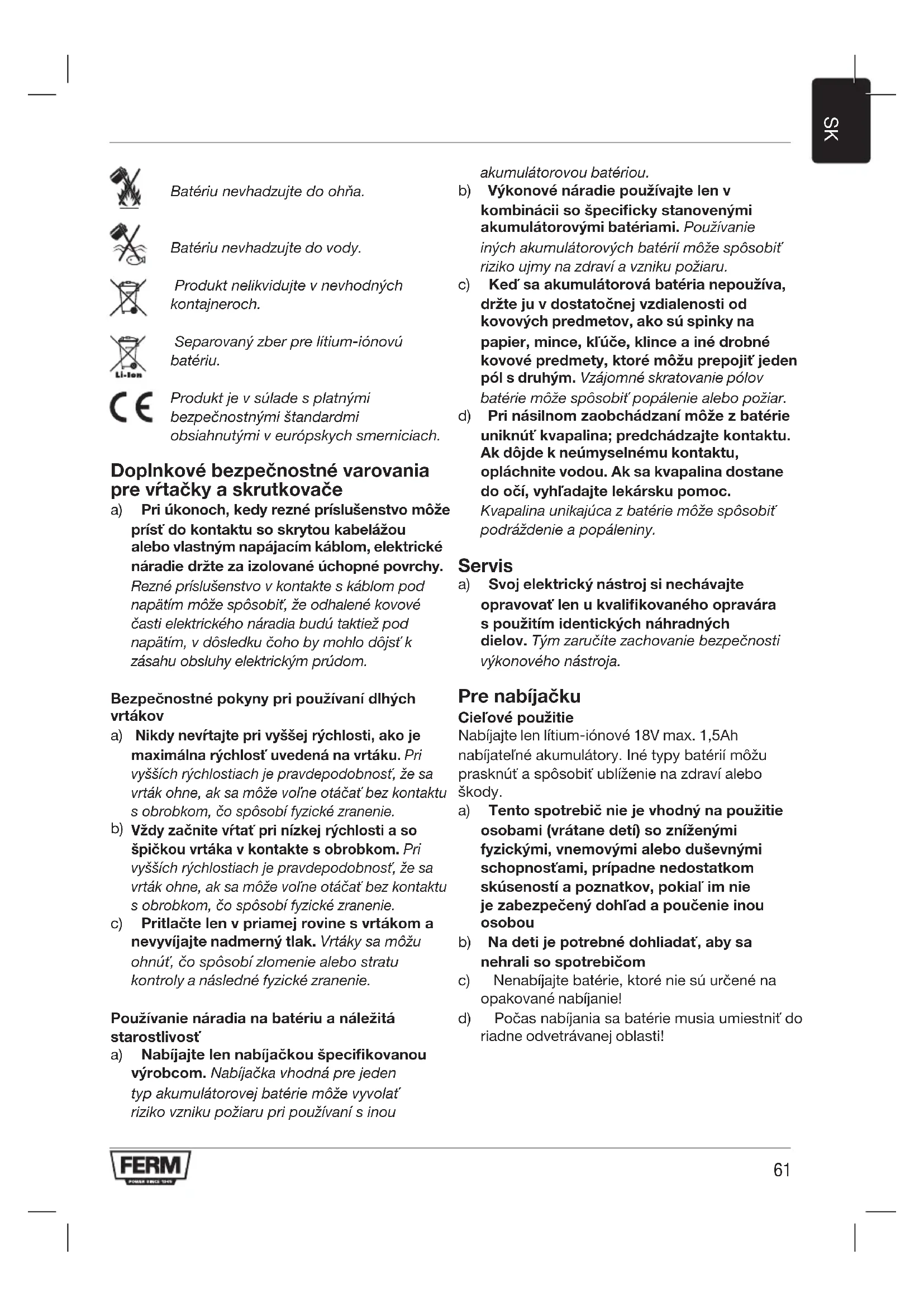 Batériu nevhadzujte do ohňa. Batériu nevhadzujte do vody. Produkt nelikvidujte v nevhodných kontajneroch. Separovaný zber pre lítium-iónovú batériu. Produkt je v súlade s platnými bezpečnostnými štandardmi obsiahnutými v európskych smerniciach. Doplnkové bezpečnostné varovania pre vŕtačky a skrutkovače a) Pri úkonoch, kedy rezné príslušenstvo môže prísť do kontaktu so skrytou kabelážou alebo vlastným napájacím káblom, elektrické náradie držte za izolované úchopné povrchy. Rezné príslušenstvo v kontakte s káblom pod napätím môže spôsobiť, že odhalené kovové časti elektrického náradia budú taktiež pod napätím, v dôsledku čoho by mohlo dôjsť k zásahu obsluhy elektrickým prúdom. Bezpečnostné pokyny pri používaní dlhých vrtákov