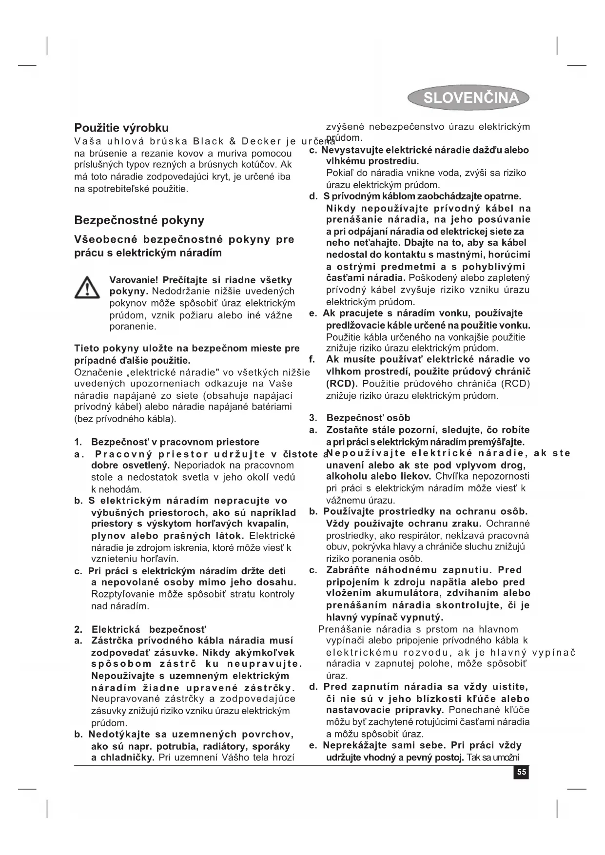 zawiesza uprawnień kupującego wynikających z niezgodności towaru z umową. Centralny Serwis Gwarancyjny ERPATECH ul. Bakaliowa 26, 05-080 Mościska tel.: (22) 862-08-08, (22) 431-05-05 faks: (22) 862-08-0955 SLOVENČINA Použitie výrobku Vaša uhlová brúska Black & Decker je určená na brúsenie a rezanie kovov a muriva pomocou príslušných typov rezných a brúsnych kotúčov. Ak má toto náradie zodpovedajúci kryt, je určené iba na spotrebiteľské použitie. Bezpečnostné pokyny Všeobecné bezpečnostné pokyny pre prácu s elektrickým náradím Varovanie! Prečítajte si riadne všetky pokyny. Nedodržanie nižšie uvedených pokynov môže spôsobiť úraz elektrickým prúdom, vznik požiaru alebo iné vážne poranenie. Tieto pokyny uložte na bezpečnom mieste pre prípadné ďalšie použitie. Označenie „elektrické náradie" vo všetkých nižšie uvedených upozorneniach odkazuje na Vaše náradie napájané zo siete (obsahuje napájací prívodný kábel) alebo náradie napájané batériami (bez prívodného kábla).