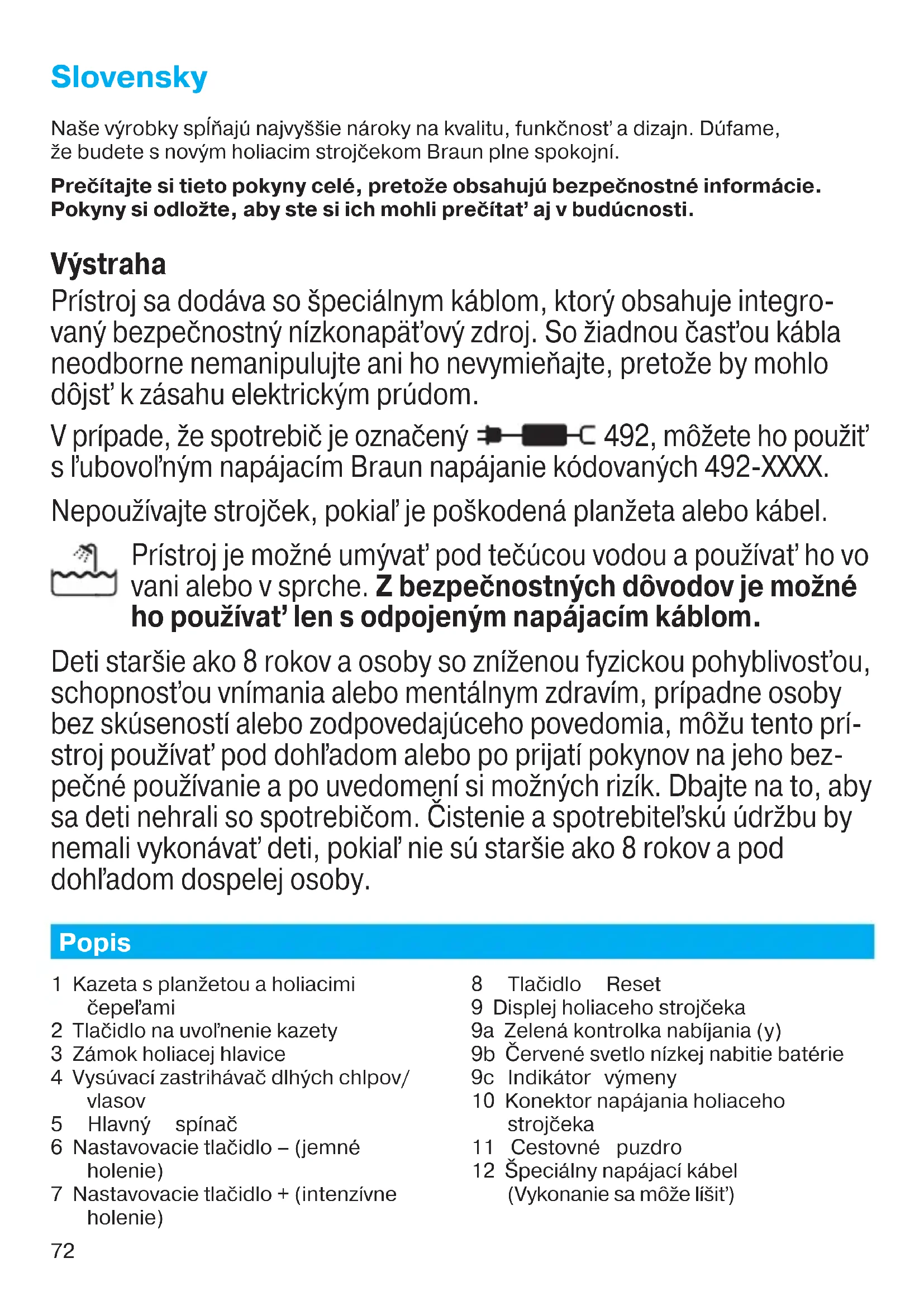 a břitovým blokem do horké vody s kapkou prostředku na mytí nádobí. Poté ji důkladně opláchněte a oklepejte. Po osušení aplikujte na planžetu kapku jemného strojového oleje. Holicí strojek se vypíná, přestože je baterie plně nabitá. Planžeta a břity jsou opotřebované, což vyžaduje více energie, než motor dokáže zajistit. Přístroj se vypíná. – Vyměňte kazetu s holicí planžetou a břitovým blokem. – Holicí systém pravidelně promazávejte, zejména po jeho čištění pod tekoucí vodou. Segmenty baterie na displeji nesignalizují snížení kapacity baterie, která přitom klesá. Planžeta a břity jsou opotřebované a pro každé oholení potřebují více energie. – Vyměňte kazetu s holicí planžetou a břitovým blokem. – Holicí systém pravidelně promazávejte, zejména po jeho čištění pod tekoucí vodou. Holicí díly byly nedávno vyměněny, ale symbol výměny se znovu rozsvítil. Nestiskli jste tlačítko reset. – Stiskněte tlačítko reset na dobu alespoň 3 sekundy, abyste vynulovali čítač. 91153500_Series_7-8_Solo_EURO_S6-140.indd 7191153500_Series_7-8_Solo_EURO_S6-140.indd 71 28.11.16 13:4228.11.16 13:42 CSS APPROVED Effective Date 30Nov2016 GMT - Printed 04Jan2017 Page 70 of 13972 Slovensky Naše výrobky spĺňajú najvyššie nároky na kvalitu, funkčnosť a dizajn. Dúfame, že budete s novým holiacim strojčekom Braun plne spokojní. Prečítajte si tieto pokyny celé, pretože obsahujú bezpečnostné informácie. Pokyny si odložte, aby ste si ich mohli prečítať aj v budúcnosti. Výstraha Prístroj sa dodáva so špeciálnym káblom, ktorý obsahuje integro- vaný bezpečnostný nízkonapäťový zdroj. So žiadnou časťou kábla neodborne nemanipulujte ani ho nevymieňajte, pretože by mohlo dôjsť k zásahu elektrickým prúdom. V prípade, že spotrebič je označený 492, môžete ho použiť s ľubovoľným napájacím Braun napájanie kódovaných 492-XXXX. Nepoužívajte strojček, pokiaľ je poškodená planžeta alebo kábel. Prístroj je možné umývať pod tečúcou vodou a používať ho vo vani alebo v sprche. Z bezpečnostných dôvodov je možné ho používať len s odpojeným napájacím káblom. Deti staršie ako 8 rokov a osoby so zníženou fyzickou pohyblivosťou, schopnosťou vnímania alebo mentálnym zdravím, prípadne osoby bez skúseností alebo zodpovedajúceho povedomia, môžu tento prí- stroj používať pod dohľadom alebo po prijatí pokynov na jeho bez- pečné používanie a po uvedomení si možných rizík. Dbajte na to, aby sa deti nehrali so spotrebičom. Čistenie a spotrebiteľskú údržbu by nemali vykonávať deti, pokiaľ nie sú staršie ako 8 rokov a pod dohľadom dospelej osoby. Popis 1 Kazeta s planžetou a holiacimi čepeľami 2 Tlačidlo na uvoľnenie kazety 3 Zámok holiacej hlavice 4 Vysúvací zastrihávač dlhých chlpov/ vlasov 5 Hlavný spínač 6 Nastavovacie tlačidlo – (jemné holenie) 7 Nastavovacie tlačidlo + (intenzívne holenie) 8 Tlačidlo Reset 9 Displej holiaceho strojčeka 9a Zelená kontrolka nabíjania (y) 9b Červené svetlo nízkej nabitie batérie 9c Indikátor výmeny 10 Konektor napájania holiaceho strojčeka 11 Cestovné puzdro 12 Špeciálny napájací kábel (Vykonanie sa môže líšiť) 91153500_Series_7-8_Solo_EURO_S6-140.indd 7291153500_Series_7-8_Solo_EURO_S6-140.indd 72 28.11.16 13:4228.11.16 13:42 CSS APPROVED Effective Date 30Nov2016 GMT - Printed 04Jan2017 Page 71 of 13973 Nabíjanie Odporúčaná okolitá teplota pri nabíjaní je 5 °C až 35 °C. Pri nadmerne nízkych alebo vysokých teplotách sa batéria nemusí nabiť správne alebo vôbec. Odporúčaná okolitá teplota pri nabíjaní je 15 °C až 35 °C. Nevystavujte holiaci strojček dlhší čas teplotám nad 50 °C.