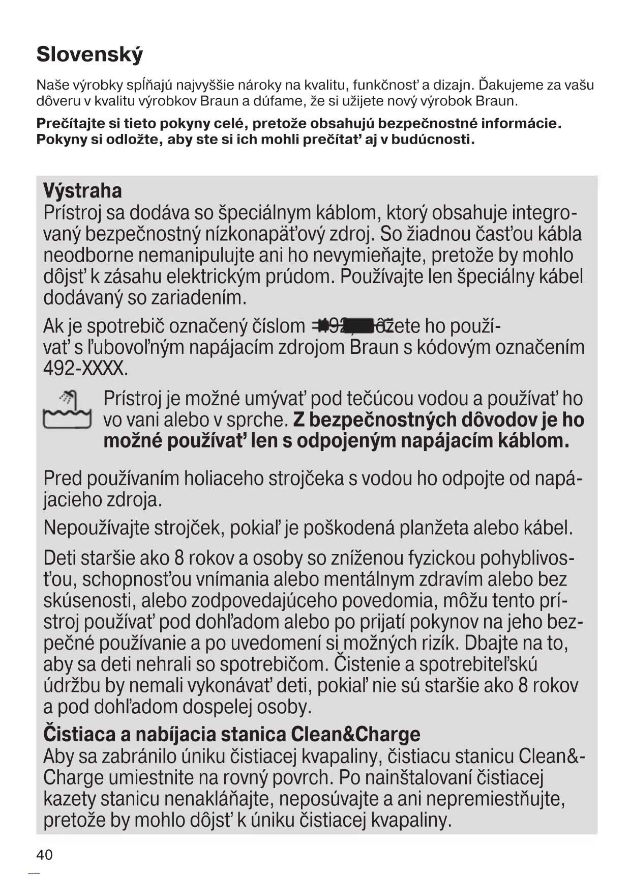- Pomocou špeciálneho napájacieho kábla (10) pripojte konektor napájania čistiacej stanice (13) do elektrickej zásuvky. Používanie stanice C&C Dôležité: Holiaci strojček musí byť suchý a bez zvyškov peny a mydla.Vložte holiaci strojček do stanice C&C hornou stranou nadol tak, aby bolo vidno prednú stranu, a s uvoľnenou zámkou hlavice (3). 91092674_Series_5-2cc_wd_CEEMEA_S6-132.indd 4391092674_Series_5-2cc_wd_CEEMEA_S6-132.indd 43 23.11.16 15:4123.11.16 15:41 CSS APPROVED Effective Date 30Nov2016 GMT - Printed 05Apr2017 Page 43 of 13244 Kontakty (7) na zadnej strane holiacej hlavice musia byť zarovnané s kontaktmi (15) v stanici C&C. Zatlačte holiaci strojček do správnej polohy.Zvukový signál potvrdí správne umiestnenie holiaceho strojčeka v stanici C&C. Stanica C&C analyzuje hygienický stav strojčeka. Stav zobrazujú indikátory čistiaceho programu (16c) na displeji stanice C&C (16). Nabíjanie holiaceho strojčeka v stanici C&C Nabíjanie sa začne automaticky, keď sa holiaci strojček správne umiestni. Čistenie holiaceho strojčeka v stanici C&C Keď svieti indikátor čistenia (5c) na displeji holiaceho strojčeka, vložte holiaci strojček do stanice C&C tak, ako je opísané vyššie. Programy čistenia krátke úsporné čistenie normálne čistenie veľmi intenzívne čistenie Spustenie automatického čistenia Proces čistenia spustite stlačením tlačidla Start (17). Ak kontrolka stavu (16b) nesvieti (stanica C&C sa po približne 10 minútach prepne do pohotovostného režimu), stlačte tlačidlo Start dvakrát. Inak sa čistenie nespustí. Na dosiahnutie čo najlepších výsledkov odporúčame čistiť strojček po každom holení. Každý čistiaci program má niekoľko cyklov, počas ktorých sa čistiaca kvapalina preplachuje cez hlavicu holiaceho strojčeka. V závislosti od modelu stanice Clean&Charge a/alebo zvoleného programu čistenie trvá najviac 3 minúty. Počas neho bliká kontrolka stavu. Holiaci strojček nechajte v stanici vyschnúť. Vyparenie zostávajúcej vlhkosti trvá niekoľko hodín v závislosti od klimatických podmienok. Po dokončení procesu čistenia a nabíjania sa všetky indikátory vypnú. Vybratie holiaceho strojčeka zo stanice C&C Jednou rukou podržte stanicu C&C a holiaci strojček jemne nakloňte dopredu, čím ho uvoľníte. Čistiaca kazeta/výmena Keď indikátor úrovne (16a) natrvalo svieti načerveno, zostávajúca kvapalina v kazete postačuje ešte približne na 3 ďalšie cykly. Keď indikátor úrovne bliká načerveno, kazetu je potrebné vymeniť – pri každodennom používaní približne raz za 4 týždne. 91092674_Series_5-2cc_wd_CEEMEA_S6-132.indd 4491092674_Series_5-2cc_wd_CEEMEA_S6-132.indd 44 23.11.16 15:4123.11.16 15:41 CSS APPROVED Effective Date 30Nov2016 GMT - Printed 05Apr2017 Page 44 of 13245 Po stlačení vysúvacieho tlačidla (14) a otvorení krytu počkajte niekoľko sekúnd, aby sa zabránilo kvapkaniu a potom vyberte použitú kazetu. Pred likvidáciou použitej kazety uzavrite všetky otvory pomocou viečok z novej kazety, pretože použitá kazeta bude obsahovať kontaminovaný čistiaci roztok. Čistiaca kazeta obsahuje látky etanol a izopropanol (technické údaje nájdete na kazete), ktoré sa po otvorení kazety pomaly vyparujú. Každú kazetu, ktorá sa nepoužíva denne, je potrebné vymeniť približne po 8 týždňoch, aby sa zabezpečila optimálna dezinfekcia. Čistiaca kazeta tiež obsahuje mazivá na holiaci systém, ktoré môžu zanechávať stopy na vonkajšom okraji planžety a čistiacej komory stanice C&C. Tieto stopy možno jednoducho odstrániť jemným utretím vlhkou handričkou. Príslušenstvo Spoločnosť Braun odporúča meniť kazetu s planžetou a holiacimi čepeľami holiaceho strojčeka každých 18 mesiacov. Maximálny výkon holiaceho strojčeka tak zostane zachovaný. Dostupné u vášho predajcu alebo v servisných centrách: