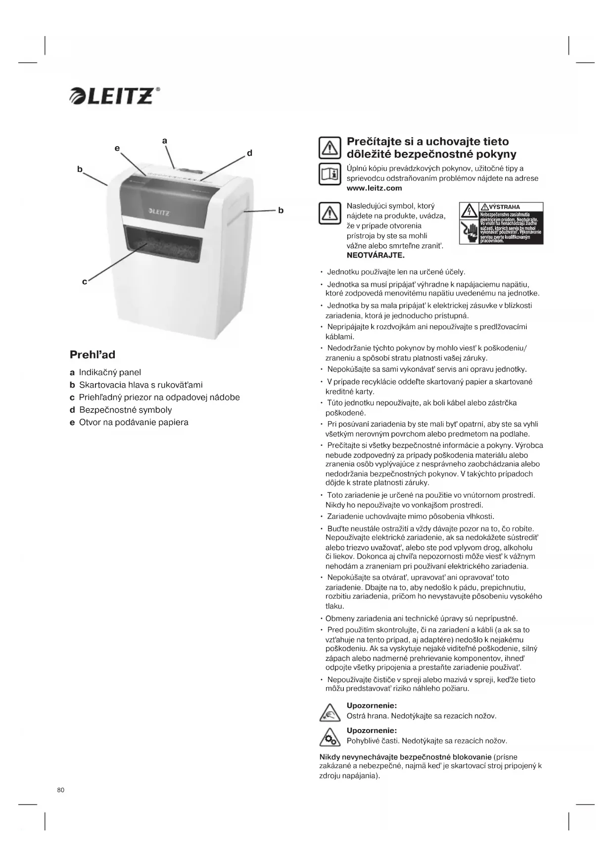 Prečítajte si a uchovajte tieto dôležité bezpečnostné pokyny Úplnú kópiu prevádzkových pokynov, užitočné tipy a sprievodcu odstraňovaním problémov nájdete na adrese www.leitz.com Prehľad a Indikačný panel b Skartovacia hlava s rukoväťami c Priehľadný priezor na odpadovej nádobe d Bezpečnostné symboly e Otvor na podávanie papiera