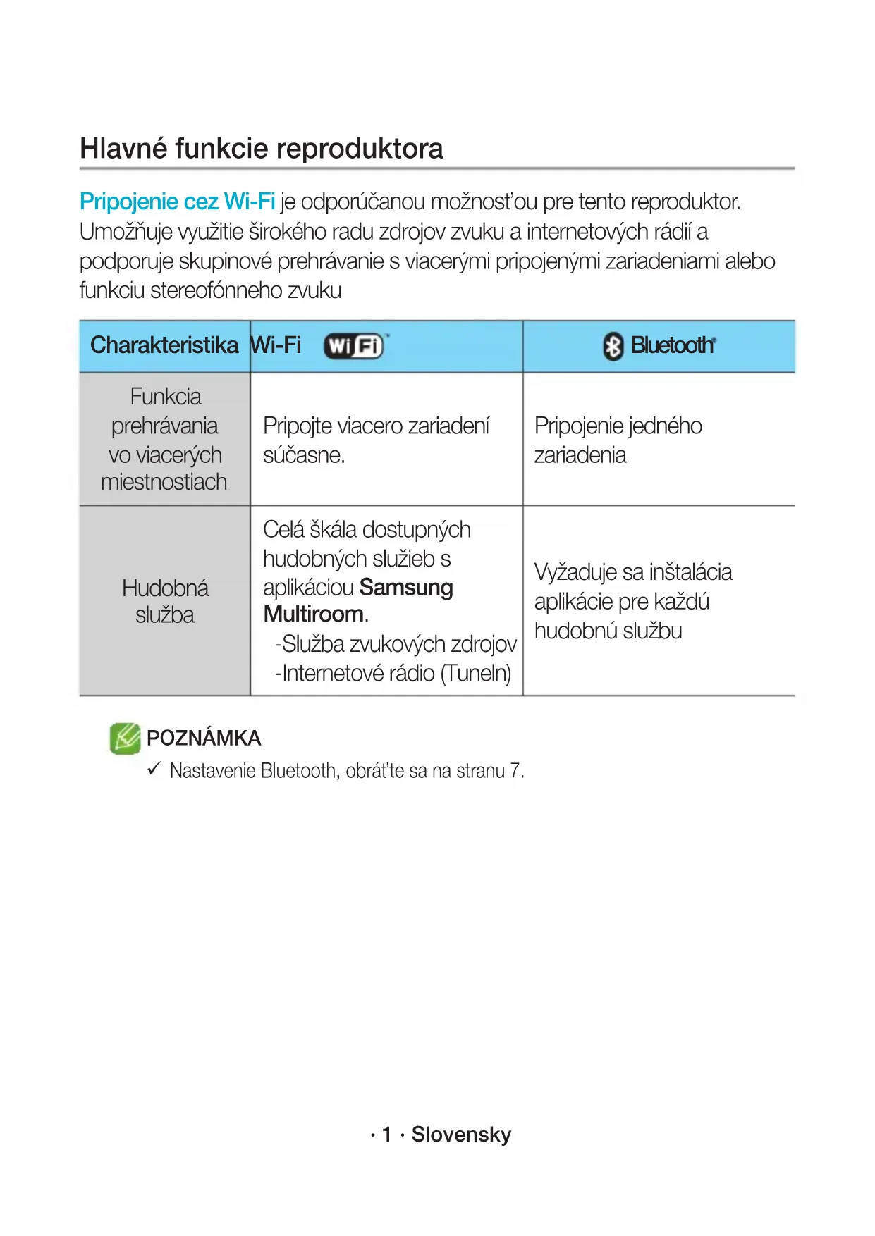 Ukoliko nije moguće uspostaviti vezu, pogledajte „Kontrolna lista pre povezivanja“ na stranama 9 i 10. WAM1501-EN_15p-SER-QSG_0901.indd 15 2016-09-01 5:04:39· 1 · Slovensky Hlavné funkcie reproduktora Pripojenie cez Wi-Fi je odporúčanou možnosťou pre tento reproduktor. Umožňuje využitie širokého radu zdrojov zvuku a internetových rádií a podporuje skupinové prehrávanie s viacerými pripojenými zariadeniami alebo funkciu stereofónneho zvuku Charakteristika Wi-Fi Bluetooth Funkcia prehrávania vo viacerých miestnostiach Pripojte viacero zariadení súčasne. Pripojenie jedného zariadenia Hudobná služba Celá škála dostupných hudobných služieb s aplikáciou Samsung Multiroom. - Služba zvukových zdrojov - Internetové rádio (Tuneln) Vyžaduje sa inštalácia aplikácie pre každú hudobnú službu POZNÁMKA