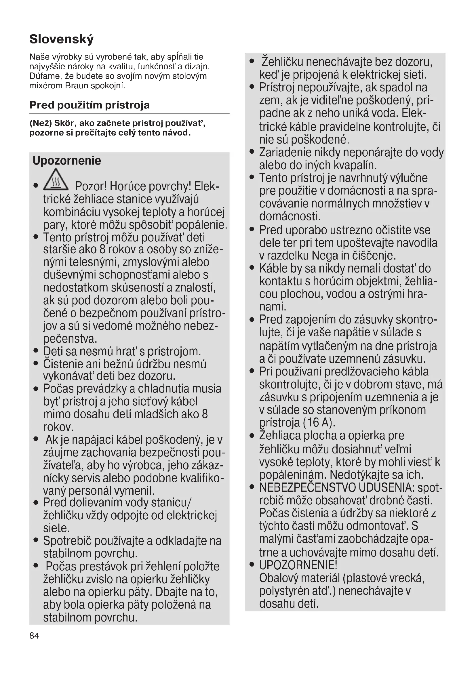 Ak je napájací kábel poškodený, je v záujme zachovania bezpečnosti pou- žívateľa, aby ho výrobca, jeho zákaz- nícky servis alebo podobne kvalifiko- vaný personál vymenil.