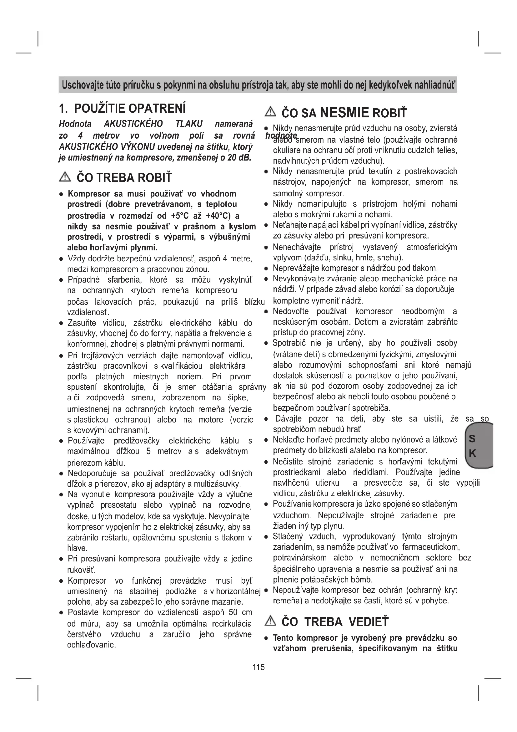 ● Nikdynenasmerujteprúdvzduchunaosoby,zvieratá alebosmerom na vlastnételo(používajte ochranné okuliarenaochranuočíprotivniknutiucudzíchtelies,nadvihnutýchprúdomvzduchu). ● Nikdy nenasmerujte prúd tekutín z postrekovacích nástrojov, napojených na kompresor, smerom na samotnýkompresor. ● Nikdy nemanipulujte s prístrojom holými nohami alebosmokrýmirukamianohami. ● Neťahajtenapájacíkábelprivypínanívidlice,zástrčky zo zásuvky alebo pri presúvaní kompresora. ● Nenechávajte prístroj vystavený atmosferickým vplyvom(dažďu,slnku,hmle,snehu).● Neprevážajtekompresorsnádržoupodtlakom. ● Nevykonávajte zváranie alebo mechanické práce na nádrži.Vprípadezávadalebokoróziísadoporučujekompletnevymeniťnádrž. ● Nedovoľte používať kompresor neodborným a neskúseným osobám. Deťom a zvieratám zabráňte prístup do pracovnej zóny. ● Spotrebič nie je určený, aby ho používali osoby (vrátanedetí)sobmedzenýmifyzickými,zmyslovýmialebo rozumovými schopnosťami ani ktoré nemajú dostatok skúseností a poznatkov o jeho používaní, ak nie sú pod dozorom osoby zodpovednej za ich bezpečnosťaleboaknebolitoutoosoboupoučenéobezpečnompoužívaníspotrebiča.● Dávajte pozor na deti, aby ste sa uistili, že sa sospotrebičomnebudúhrať. ● Neklaďtehorľavépredmetyalebonylónovéalátkové predmetydoblízkostia/alebonakompresor. ● Nečistite strojné zariadenie s horľavými tekutými prostriedkami alebo riedidlami. Používajte jedinenavlhčenú utierku a presvedčte sa, či ste vypojilividlicu,zástrčkuzelektrickejzásuvky. ● Používaniekompresorajeúzkospojenésostlačeným vzduchom. Nepoužívajte strojné zariadenie prežiadeninýtypplynu. ● Stlačený vzduch, vyprodukovaný týmto strojným zariadením,sanemôžepoužívaťvofarmaceutickom,potravinárskom alebo v nemocničnom sektore bez špeciálnehoupraveniaanesmiesapoužívaťanina plneniepotápačskýchbômb. ● Nepoužívajtekompresor bez ochrán (ochranný kryt remeňa)anedotýkajtesačastí,ktorésúvpohybe.