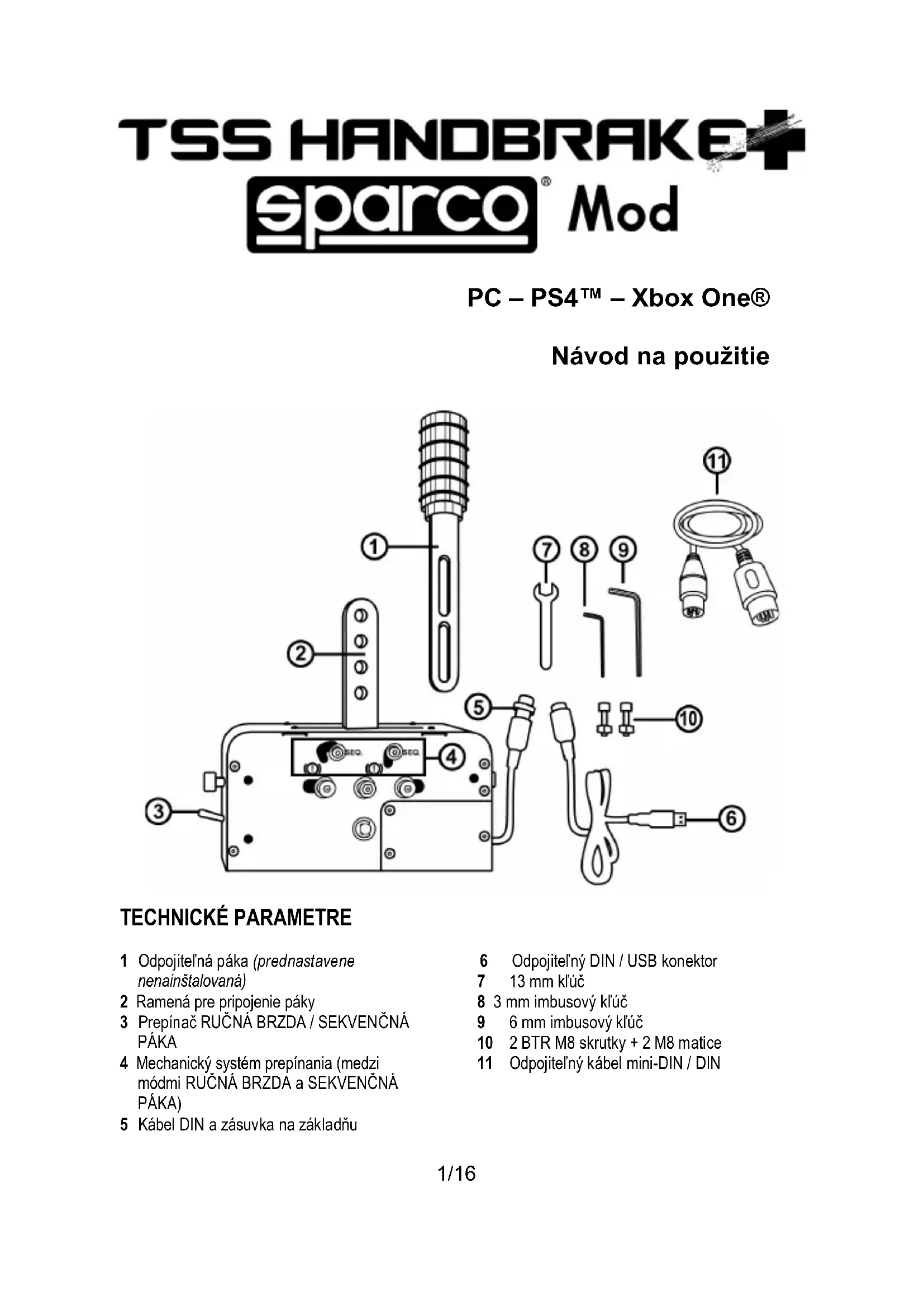 TECHNICKÉ PARAMETRE 1 Odpojiteľná páka (prednastavene nenainštalovaná) 2 Ramená pre pripojenie páky 3 Prepínač RUČNÁ BRZDA / SEKVENČNÁ PÁKA 4 Mechanický systém prepínania (medzi módmi RUČNÁ BRZDA a SEKVENČNÁ PÁKA) 5 Kábel DIN a zásuvka na základňu 6 Odpojiteľný DIN / USB konektor 7 13 mm kľúč 8 3 mm imbusový kľúč 9 6 mm imbusový kľúč 10 2 BTR M8 skrutky + 2 M8 matice 11 Odpojiteľný kábel mini-DIN / DIN2/16 UPOZORNENIE Pred použitím tohto výrobku si pozorne prečítajte tento návod. Uschovajte tento návod pre budúce použitie. Upozornenie – Elektrický šok