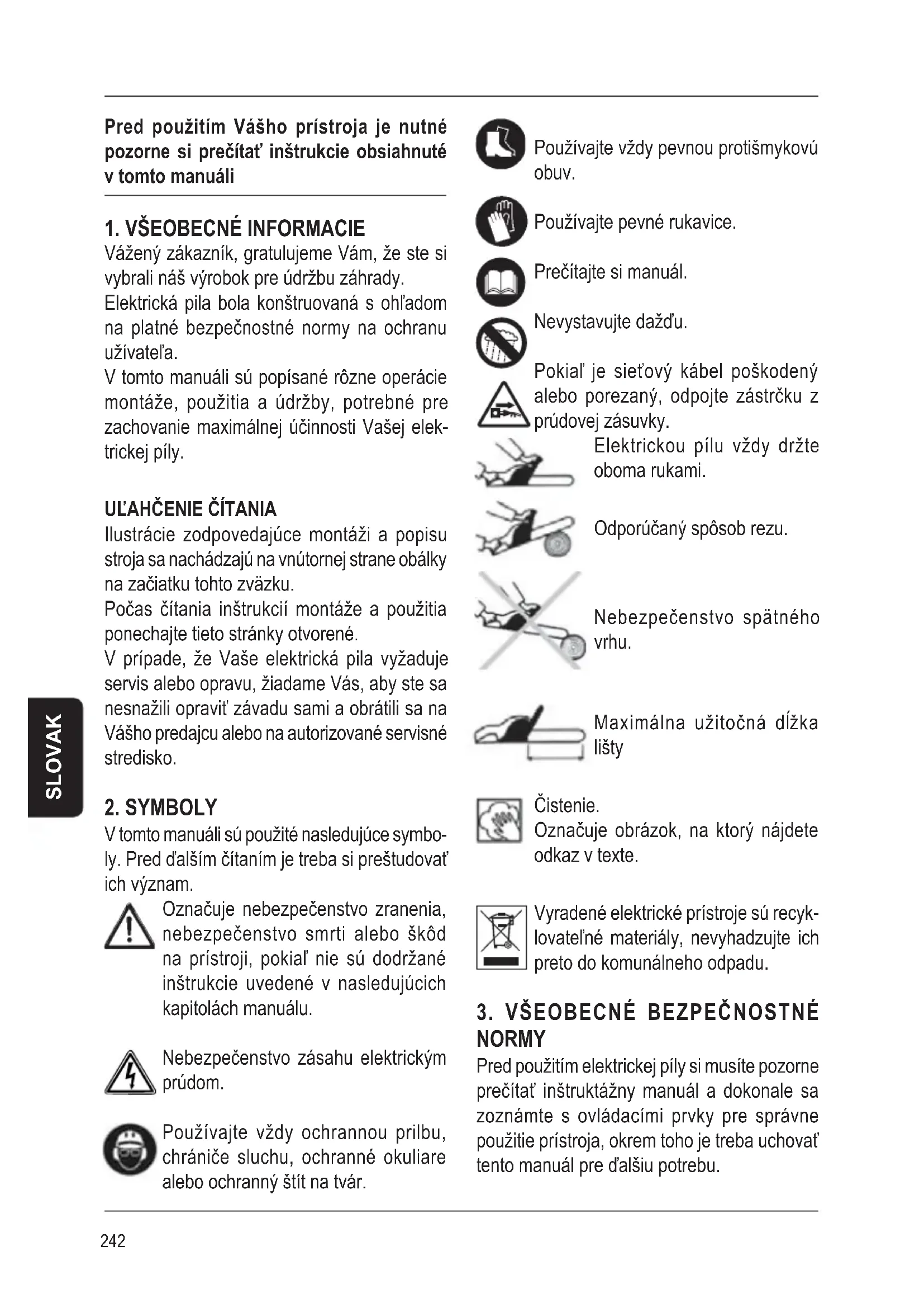 V tomto manuáli sú použité nasledujúce symbo- ly. Pred ďalším čítaním je treba si preštudovať ich význam. Označuje nebezpečenstvo zranenia, nebezpečenstvo smrti alebo škôd na prístroji, pokiaľ nie sú dodržané inštrukcie uvedené v nasledujúcich kapitolách manuálu. Nebezpečenstvo zásahu elektrickým prúdom. Používajte vždy ochrannou prilbu, chrániče sluchu, ochranné okuliare alebo ochranný štít na tvár. Používajte vždy pevnou protišmykovú obuv. Používajte pevné rukavice. Prečítajte si manuál. Nevystavujte dažďu. Pokiaľ je sieťový kábel poškodený alebo porezaný, odpojte zástrčku z prúdovej zásuvky. Elektrickou pílu vždy držte oboma rukami. Odporúčaný spôsob rezu. Nebezpečenstvo spätného vrhu. Maximálna užitočná dĺžka lišty Čistenie. Označuje obrázok, na ktorý nájdete odkaz v texte. Vyradené elektrické prístroje sú recyk- lovateľné materiály, nevyhadzujte ich preto do komunálneho odpadu.