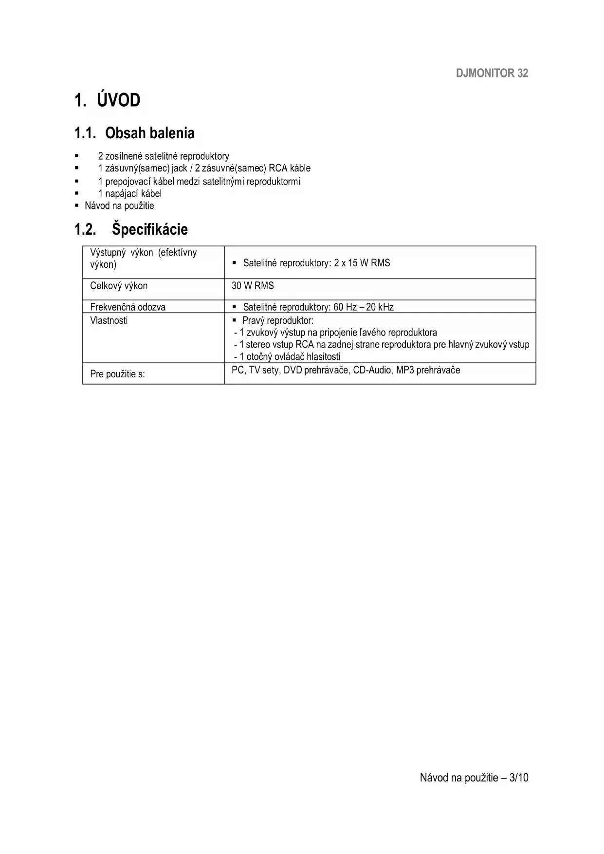 1.1. Obsah balenia 2 zosilnené satelitné reproduktory 1 zásuvný(samec) jack / 2 zásuvné(samec) RCA káble 1 prepojovací kábel medzi satelitnými reproduktormi 1 napájací kábel Návod na použitie 1.2. Špecifikácie Výstupný výkon (efektívny výkon) Satelitné reproduktory: 2 x 15 W RMS Celkový výkon 30 W RMS Frekvenčná odozva Satelitné reproduktory: 60 Hz – 20 kHz Vlastnosti Pravý reproduktor: - 1 zvukový výstup na pripojenie ľavého reproduktora - 1 stereo vstup RCA na zadnej strane reproduktora pre hlavný zvukový vstup - 1 otočný ovládač hlasitosti Pre použitie s: PC, TV sety, DVD prehrávače, CD-Audio, MP3 prehrávačeDJMONITOR 32 4/10 – Návod na použitie 1.3. Odporúčania - Satelitné reproduktory umiestnite na rovný povrch, aby ste predišli riziku pádu reproduktorov. - Reproduktory nikdy neotvárajte, pretože riskujete poškodenie ich vnútorných komponentov. - Tieto reproduktory sú určené na použitie v kľudnom prostredí. - Aby ste predišli riziku požiaru alebo elektrického výboja, držte reproduktory mimo: - dažďu alebo vlhkosti, ako aj všetkých tekutín (voda, chemické výrobky alebo akékoľvek iné kvapaliny), - zdrojov tepla, ako sú ohrievače, sporáky alebo akékoľvek iné zariadenia produkujúce teplo (vrátane zosilňovačov), - priameho slnečného svetla. - Nevystavujte reproduktory kvapkajúcej ani striekajúcej vode. - Na reproduktory nikdy neklaďte žiadny predmet naplnený tekutinou (pohár, váza ...). - Ak nechcete reproduktory dlhší čas používať, vypnite ich. Ak chcete odpojiť napájací kábel, uchopte a vytiahnite zástrčku, nikdy neťahajte za kábel. - Uistite sa, že sieťová zástrčka reproduktorovej súpravy pripojená k elektrickej zásuvke zostáva ľahko prístupná. - Pred čistením reproduktory vypnite. Používajte vlhkú handričku a nepoužívajte aerosólové čistiace prostriedky. - Sieťová zástrčka súpravy reproduktorov slúži na vypnutie zariadenia, a preto musí byť vždy ľahko prístupná. - Značky sú umiestnené na zadnej strane reproduktorov.