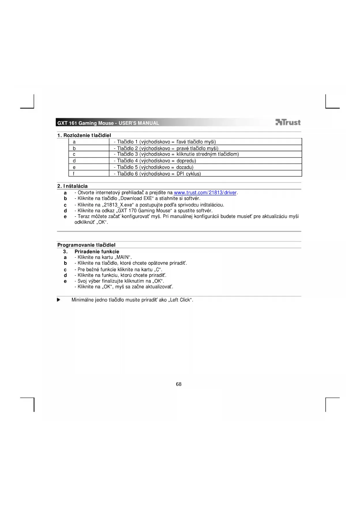 Minimálne jedno tlačidlo musíte priradiť ako „Left Click“.GXT 161 Gaming Mouse - USER’S MANUAL