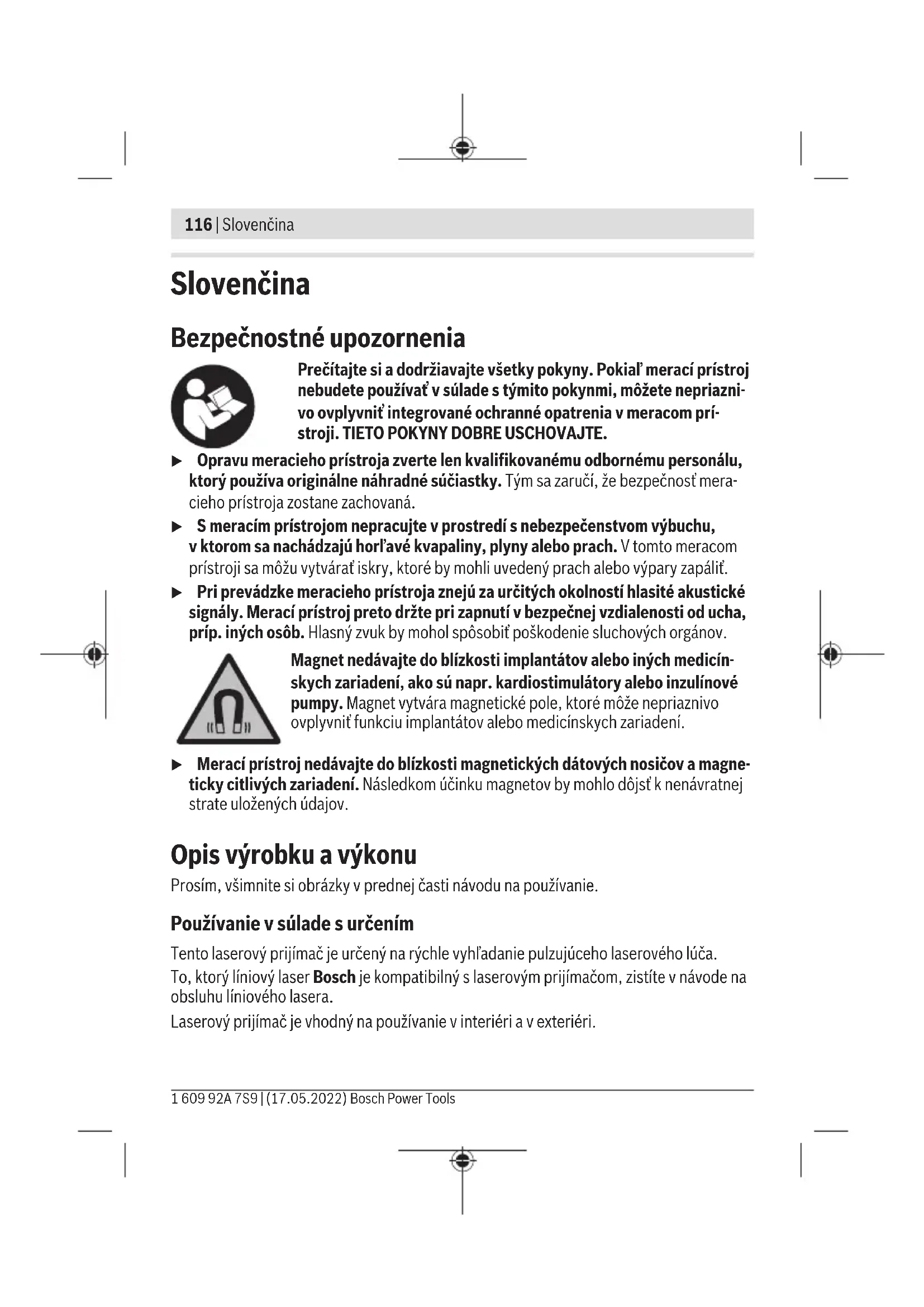 Batérie 2×1,5V LR3(AAA) Doba prevádzky cca 30h Hmotnosť podľa EPTA-Procedure01:2014 0,12kg Rozmery (dĺžka× šírka× výška) 69×28×123mm Stupeň ochrany IP54 (chránené proti prachu astriekajúcej vode) A) Pracovná oblasť sa môže zredukovať nepriaznivými podmienkami okolia (napr. priame slnečné žiarenie). B) X: maximálna pracovná oblasť pre prevádzku slaserovým prijímačom podľa návodu na obsluhu použitého líniového laseraBosch C) vzávislosti od vzdialenosti medzi prijímačom laserového lúča alíniového lasera D) Vyskytuje sa len nevodivé znečistenie, pričom sa však príležitostne očakáva dočasná vodivosť spôsobená kondenzáciou. Na jednoznačnú identifikáciu vášho laserového prijímača slúži sériové číslo (13) na výrobnom štítku. Informácie ohlučnosti Hladina akustického tlaku vysávača pri použití váhového filtra Aje typicky80dB(A). Laserový prijímač nedržte tesne pri uchu! 1 609 92A 7S9 | (17.05.2022) Bosch Power ToolsSlovenčina | 119 Montáž Vkladanie/výmena batérií Pri prevádzke tohto laserového prijímača odporúčame používanie alkalicko-mangá- nových batérií. Vytiahnite aretáciu (15) priehradky na batériu smerom von avyklopte veko priehradky na batériu (14). Vložte batérie. Dávajte pritom pozor na správnu polaritu podľa vyobrazenia na veku priehradky na baté- rie. Ak sú batérie slabé, stavová indikácia začne blikať(3). Práca slaserovým prijímačom je možná ešte asi 2h. Vždy vymieňajte všetky batérie súčasne. Používajte len batérie od jedného výrobcu asrovnakou kapacitou. u Ak laserový prijímač dlhší čas nepoužívate, vyberte z neho batérie. Batérie môžu pri dlhšom skladovaní vlaserovom prijímači korodovať amôže dochádzať kich samo- činnému vybíjaniu. Prevádzka Uvedenie do prevádzky u Chráňte laserový prijímač pred vlhkosťou a pred priamym slnečným žiarením. u Laserový prijímač nevystavujte extrémnym teplotám alebo teplotným výkyvom. Nenechávajte ho napríklad dlhší čas ležať vautomobile. V prípade väčšieho kolísania teplôt nechajte najprv laserový prijímač pred jeho použitím temperovať na teplotu prostredia, v ktorom ho budete používať. Pri extrémnych teplotách alebo v prípade kolísania teplôt môže byť negatívne ovplyvnená presnosť laserového prijímača. Inštalácia laserového prijímača (pozriobrázokA) Postavte laserový prijímač do vzdialenosti minimálne5m od líniového lasera. Skontroluj- te, či je režim prijímača na líniovom laseri aktívny. Zvoľte pracovný režim, pri ktorom sa vytvorí buď len vodorovná alebo len zvislá laserová rovina. Upozornenie: Nezvoľte druh prevádzky svodorovnou azvislou laserovou rovinou súčas- ne (prevádzka skrížovým laserom), inak môže dôjsť kchybnému zobrazeniu výšky la- serového lúča. Umiestnite laserový prijímač tak, aby laserový lúč mohol zasiahnuť políčko príjmu(9). Nastavte ho tak, aby laserový lúč prebiehal cez políčko príjmu priečne (ako je zobrazené na obrázku). Bosch Power Tools 1 609 92A 7S9 | (17.05.2022)120 | Slovenčina Zapínanie/vypínanie u Pri zapnutí laserového prijímača zaznie zvukový signál. Laserový prijímač preto držte pri zapnutí vbezpečnej vzdialenosti od ucha, príp. iných osôb. Hlasný zvuk by mohol spôsobiť poškodenie sluchových orgánov. Laserový prijímač zapnete stlačením vypínača(2). Všetky LED kontrolky sanakrátko rozsvietia azaznie zvukový signál. Po zapnutí laserového prijímača je nastavená vždy nízka hlasitosť apresnosť príjmu na „presná“. Laserový prijímač vypnete opätovným stlačením vypínača(2). Pred vypnutím sa nakrát- ko rozsvietia všetky LED kontrolky azaznejú tri zvukové signály. Stavová indikácia(3) zhasne. Ak sa približne 20min nestlačí žiadne tlačidlo laserového prijímača apolíčko príjmu(9) 20min nezasiahne žiaden laserový lúč, potom sa laserový prijímač zdôvodu šetrenia batérie automaticky vypne. Výber nastavenia indikácie stredovej línie Pomocou tlačidla nastavenia presnosti príjmu(1) môžete určiť, sakou presnosťou sa má zobrazovať pozícia laserového lúča na políčku príjmu ako „stredová“: – presnosť príjmu „presná“ (LED kontrolka stredovej línie(7) bliká), – presnosť príjmu „približná“ (LED indikácie smeru „Laserový lúč nad stredovou líniou“(6) a„Laserový lúč pod stredovou líniou“(8) blikajú). Smerové indikácie Pozícia laserového lúča vpolíčku príjmu(9) sa zobrazuje: – pomocou LED kontroliek indikácií smeru „Laserový lúč nad stredovou líniou“(6), „La- serový lúč pod stredovou líniou“(8) alebo stredová línia(7) na prednej azadnej strane laserového prijímača, – voliteľne zvukovým signálom. Laserový prijímač je príliš nízko: Ak laserový lúč prechádza cez hornú polovicu políčka príjmu(9), svietia LED indikácie smeru „Laserový lúč nad stredovou líniou“(6). Pri zapnutom zvukovom signáli znie signál vo vysokej frekvencii. Pohnite laserový prijímač vsmere šípky nahor. Laserový prijímač je príliš vysoko: Ak laserový lúč prechádza cez dolnú polovicu políč- ka príjmu(9), svietia LED indikácie smeru „Laserový lúč pod stredovou líniou“(8). Pri zapnutom zvukovom signáli znie signál vnízkej frekvencii. Pohnite laserový prijímač vsmere šípky nadol. 1 609 92A 7S9 | (17.05.2022) Bosch Power ToolsSlovenčina | 121 Laserový prijímač vstrede: Ak prechádza laserový lúč políčkom príjmu(9) vo výške stredovej značky(12), svietia LED kontrolky stredovej línie(7). Pri zapnutom zvukovom signáli zaznie trvalý tón. Zvukový signál na indikáciu laserového lúča Pozícia laserového lúča vpolíčku príjmu (9) sa môže indikovať zvukovým signálom. Hlasitosť môžete zmeniť alebo zvukový signál vypnúť. Ak chcete