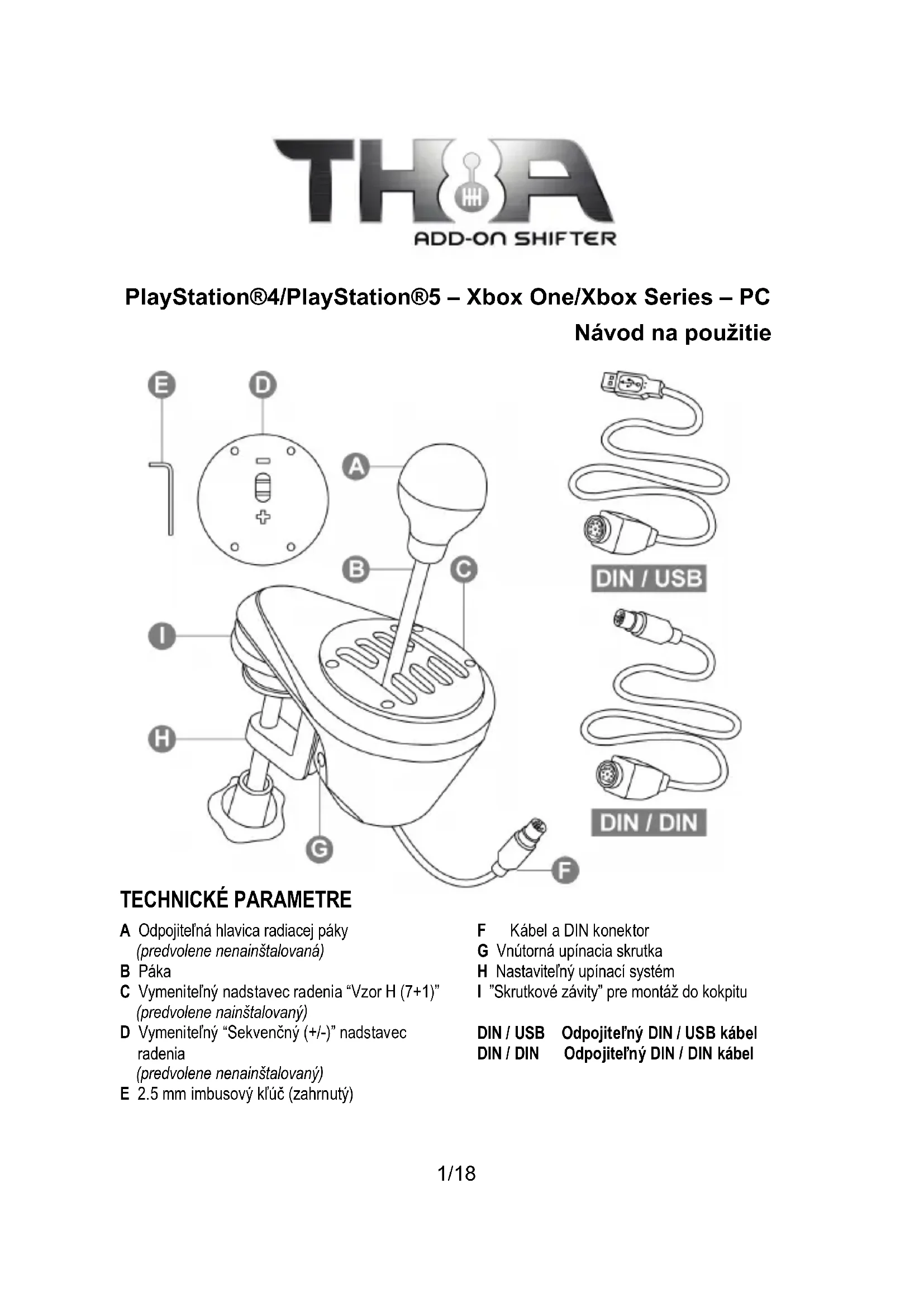 TECHNICKÉ PARAMETRE A Odpojiteľná hlavica radiacej páky (predvolene nenainštalovaná) B Páka C Vymeniteľný nadstavec radenia “Vzor H (7+1)” (predvolene nainštalovaný) D Vymeniteľný “Sekvenčný (+/-)” nadstavec radenia (predvolene nenainštalovaný) E 2.5 mm imbusový kľúč (zahrnutý) F Kábel a DIN konektor G Vnútorná upínacia skrutka H Nastaviteľný upínací systém I ”Skrutkové závity” pre montáž do kokpitu DIN / USB Odpojiteľný DIN / USB kábel DIN / DIN Odpojiteľný DIN / DIN kábel2/18 UPOZORNENIE Pred použitím tohto výrobku si pozorne prečítajte tento návod. Tento návod si uschovajte pre budúce použitie. Upozornenie – Elektrický šok