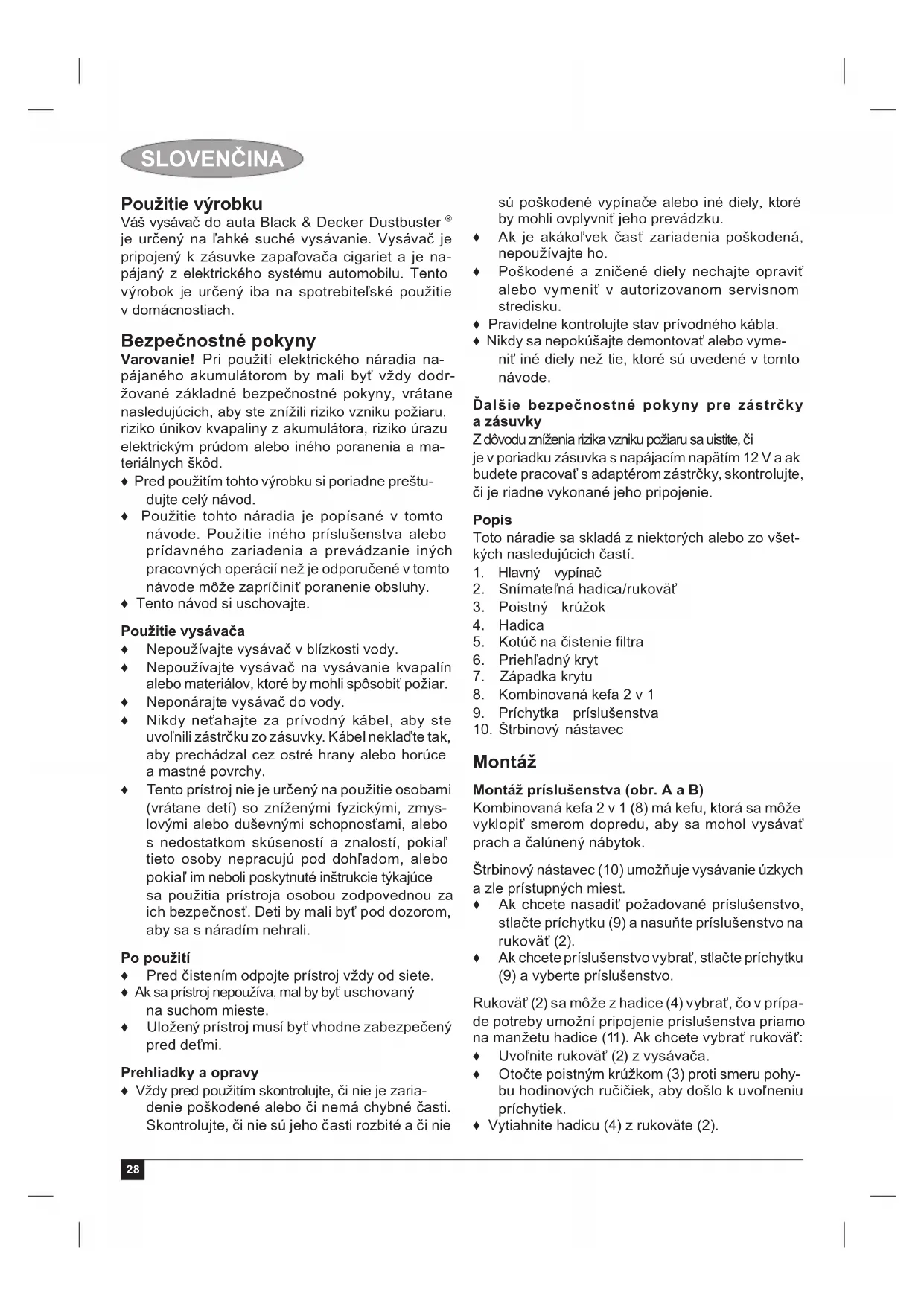 Montáž Montáž príslušenstva (obr. A a B) Kombinovaná kefa 2 v 1 (8) má kefu, ktorá sa môže vyklopiť smerom dopredu, aby sa mohol vysávať prach a čalúnený nábytok. Štrbinový nástavec (10) umožňuje vysávanie úzkych a zle prístupných miest. ♦ Ak chcete nasadiť požadované príslušenstvo, stlačte príchytku (9) a nasuňte príslušenstvo na rukoväť (2). ♦ Ak chcete príslušenstvo vybrať, stlačte príchytku (9) a vyberte príslušenstvo. Rukoväť (2) sa môže z hadice (4) vybrať, čo v prípa- de potreby umožní pripojenie príslušenstva priamo na manžetu hadice (11). Ak chcete vybrať rukoväť: ♦ Uvoľnite rukoväť (2) z vysávača. ♦ Otočte poistným krúžkom (3) proti smeru pohy- bu hodinových ručičiek, aby došlo k uvoľneniu príchytiek. ♦ Vytiahnite hadicu (4) z rukoväte (2).29 SLOVENČINA ♦ Pripojte požadované príslušenstvo priamo k manžete hadice (11). Ak chcete rukoväť znovu nasadiť: ♦ Odpojte príslušenstvo od hadice. ♦ Zasuňte hadicu (4) do rukoväte (2). Otočte po- istným krúžkom (3) v smere pohybu hodinových ručičiek, aby došlo k jeho riadnemu zaisteniu. Použitie Pripojenie k zdroju pomocou zástrčky pre príslušenstvo s jednosmerným napätím 12 V (obr. C a D) Poznámka: Kolík zástrčky je kladný (+) a bočný kontakt je záporný (-). ♦ Vytiahnite zástrčku pre príslušenstvo s napája- cím jednosmerným napätím 12 V (12) z držiaku (13), ktorý sa nachádza v základni vysávača. ♦ Uvoľnite príchytku kábla (14) z úložného miesta kábla. ♦ Odviňte z úložného miesta (15) celú dĺžku prí- vodného kábla. ♦ Zasunutím zástrčky pre príslušenstvo priamo do zásuvky pre príslušenstvo (12) vo vozidle alebo do zásuvky iného zdroja jednosmerného napätia pripojte vysávač k zdroju napätia. Poznámka: Niektoré vozidlá majú zásuvku príslu- šenstva funkčnú iba v prípade, že je kľúčik v zapa- ľovaní v polohe pre príslušenstvo (accessory). Varovanie! Nepoužívajte tento prístroj s elektric- kými systémami, ktoré sú uzemnené na kladný pól (napríklad staršie vozidlá). Varovanie! Pripojenie s opačnou polaritou spôsobí prepálenie poistky a môže spôsobiť trvalé poško- denie prístroja. ♦ Po ukončení práce s vysávačom: ♦ Odpojte zástrčku pre príslušenstvo (12) od zdroja s napájacím napätím 12 V. ♦ Zviňte prívodný kábel, uložte ho do úložného priestoru (15) a zaistite ho pomocou príchytky (14). ♦ Uložte zástrčku pre príslušenstvo s napájacím jednosmerným napätím 12 V (12) do držiaku (13), ktorý sa nachádza v základni vysávača. Zapnutie a vypnutie ♦ Ak chcete prístroj zapnúť, posuňte hlavný vypí- nač (1) doprava. ♦ Ak chcete vysávač vypnúť, posuňte hlavný vy- pínač (1) doľava tak, aby došlo k jeho riadnemu nastaveniu do polohy vypnuté (Off). Vysávač môže byť používaný až 30 minút bez toho, aby došlo k nápadnému poklesu výkonu štandard- ne nabitej batérie automobilu, ktorá je v dobrom stave. Varovanie! Dlhšie používanie znižuje výkon batérie. Počas vysávania nezapínajte motor vozidla, znížila by sa tak životnosť vysávača. Vysávanie ♦ Pri práci s vysávačom sa uistite, či nie je na- sávacia hadica uzatvorená, skrútená alebo zablokovaná. ♦ Z vysávača sa môže ľahko vybrať rukoväť (2), čo predĺži dosah hadice až do vzdialenosti 1,5 m od vysávača. ♦ Ak sa rukoväť (2) vyberie, vysávač sa môže prenášať pomocou zabudovanej rukoväte. ♦ Rukoväť (2) sa môže z hadice (4) vybrať, čo v prípade potreby umožní pripojenie príslušen- stva priamo na manžetu hadice (11). Rady na optimálne použitie ♦ Ak vysávate schodisko, vždy začínajte dole a postupujte smerom hore. Optimálny sací výkon Pokiaľ chcete udržať optimálny sací výkon, musíte behom používania pravidelne čistiť fi lter. ♦ Otočte kotúčom na čistenie fi ltra (5) o dve otáčky v smere pohybu hodinových ručičiek, aby došlo k odstráneniu nečistôt z fi ltrov. ♦ Čistenie fi ltra jemných prachových častíc sa musí robiť pravidelne, viď časť „Čistenie fi ltra jemných prachových častíc“. Čistenie a údržba Vaše náradie Black & Decker bolo skonštruované tak, aby Vám slúžilo dlhú dobu s minimálnymi ná- rokmi na údržbu. Pravidelná starostlivosť o náradie a jeho pravi- delné čistenie Vám zaistia jeho bezproblémovú prevádzku. Varovanie! Pred začatím akejkoľvek údržby alebo čistenia prístroj odpojte od elektrickej zásuvky. Občas zariadenie utrite navlhčenou handričkou. Ne- používajte žiadne brúsne alebo rozpúšťacie čistiace prostriedky. Neponárajte toto zariadenie do vody. Vyprázdnenie zásobníka vysávača (obr. E) Zásobník vysávača sa musí vyprázdňovať pravidel- ne, najlepšie po ukončení každého vysávania. ♦ Uvoľnite západku krytu (7) a otvorte priehľadný kryt (6) o 180° tak, aby došlo k jeho zaisteniu v otvorenej polohe. ♦ Vyberte fi lter (16). ♦ Vyprázdnite zásobník. ♦ Vyčistite fi lter (16) ľahkým poklepaním o nádobu na odpadky. ♦ Vložte fi lter (16) na pôvodné miesto.30 SLOVENČINA ♦ Uzavrite priehľadný kryt (6) a uistite sa, či je tento kryt riadne zaistený v zatvorenej polohe. Varovanie! Nikdy, zo žiadnych dôvodov, zásobník vysávača nevyplachujte vodou. Varovanie! Neponárajte vysávač do vody. Na čis- tenie povrchu vysávača by sa mala používať navlh- čená handrička a mydlový roztok. Pred opätovným použitím alebo pred uložením sa vždy uistite, či je vysávač celkom suchý. Čistenie filtra jemných prachových častíc (obr. F) Filter jemných prachových častíc (17) zabraňuje vniknutiu prachových častíc a väčších nečistôt do motorového priestoru. Filter (17) môže byť opakovane použitý a mal by byť pravidelne čistený. ♦ Podľa vyššie uvedeného postupu vybe