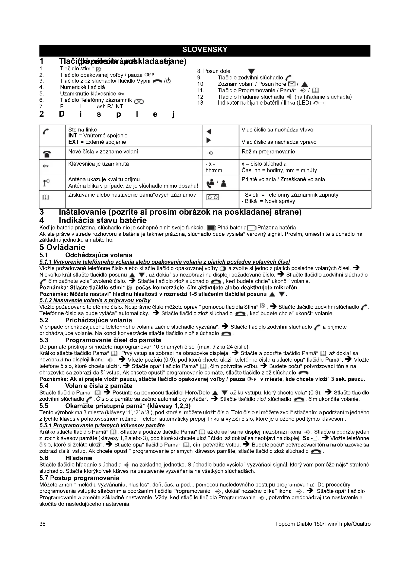 Ovládanie telefónneho záznamníka môžete spustis stlaþením tlaþidla Telefónny záznamník . Ak máte nové správy, zaþnú sa prehrávas do slúchadla. Ak sa prehrajú všetky nové správy, môžu sa zmazas stlaþením tlaþidla poþas 8 sekúnd prehrávania konca poslednej správy. Ovládanie telefónneho záznamníka môžete opustis opätovným stlaþením tlaþidla . Ak sa poþas 8 sekúnd neprijme žia dna inštrukcia, jednotka sa vráti do pohotovostného režimu. Nasledujúce funkcie sú dostupné pri stlaþení numerických klávesov: ‘1’ Poþúvas hl avné menu ‘2’ Prehrávas všetky správy ‘3’ Prehrávas nové správy ‘4’ Preskoþis naspäs poþas prehrávania správy ‘5’ Zmazanie správ ‘6’Preskoþis dopredu poþas prehrávania správy ‘7’ Nastavenie odkazu Zap. alebo Vyp.38 Topcom Diablo 150/Twin/Triple/Quattro ‘8’ Vypoþus si menu odpovedajúcej správy ‘9’ Nastavis bezpeþnostný kód ‘0’Nastavis deĖ ‘*’ Nastavenie meškania odpovede ‘#’ Nahrávas poznámku