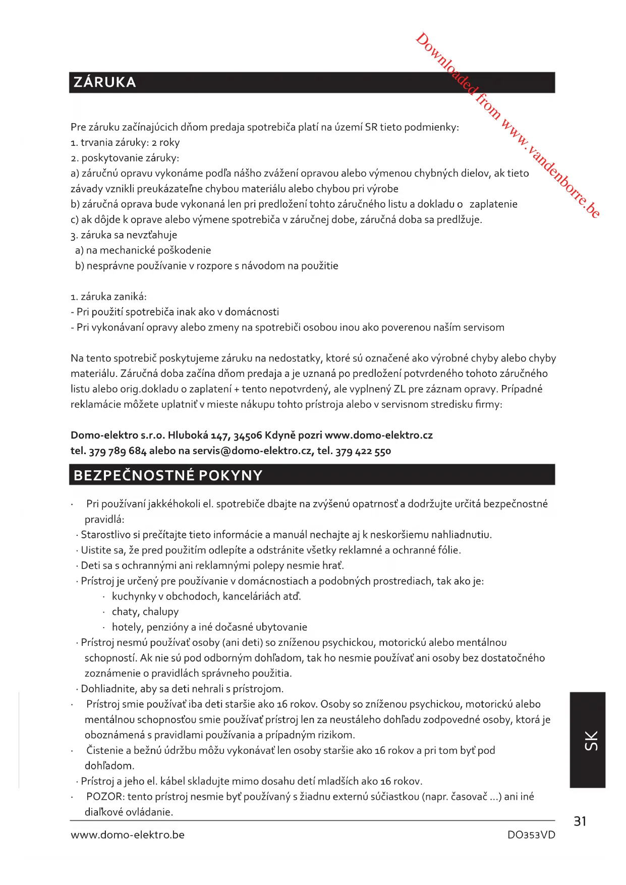 Symbol na prístroji alebo na jeho obale znamená, že s týmto výrobkom nie je možné nakladať ako s domovým odpadom, ale musí byť odovzdaný na miestach určených na zber a likvidáciu elektrických a elektronických zariadení. Dodržaním tohto odporúčania chránite životné prostredie a zdravie spoluobčanov. Viac informácií o možnostiach likvidácie nebezpečného odpadu obdržíte na obecných alebo mestských úradoch, zberných dvoroch alebo v predajni, kde ste prístroj zakúpili. Obalové materiály sú recyklovateľné, nakladajte s nimi podľa predpisov pre životné prostredie. Downloaded from www.vandenborre.be35 DO353VD www.domo-elektro.be