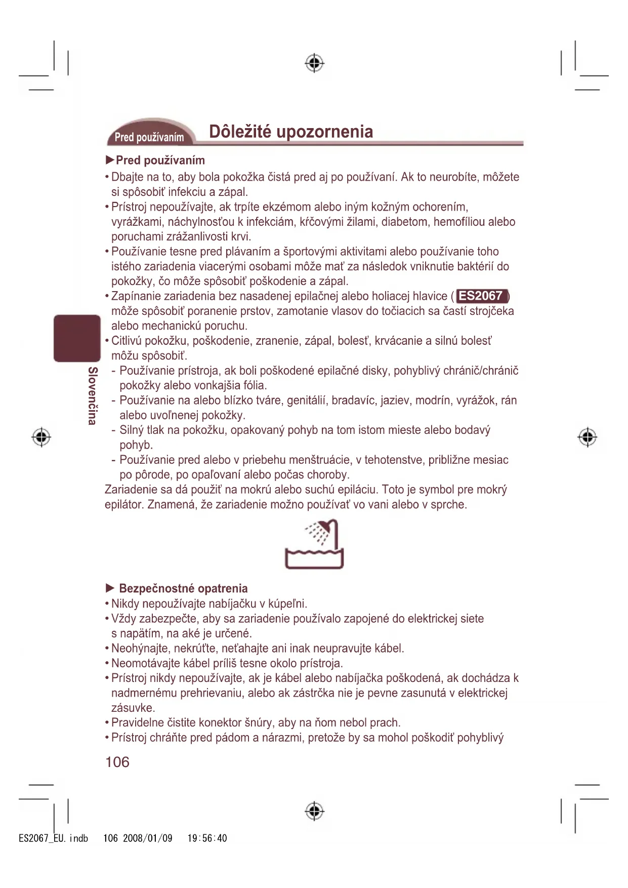 Stojánek Příslušenství: Nabíječka (RE7-46), čisticí kartáček a pouzdro (Nepoužívejte jiné než dodané příslušenství.) ES2067_EU.indb 105 2008/01/09 19:56:40106 Slovenčina Dôležité upozornenia Pred používaním Pred používaním Dbajte na to, aby bola pokožka čistá pred aj po používaní. Ak to neurobíte, môžete si spôsobiť infekciu a zápal. Prístroj nepoužívajte, ak trpíte ekzémom alebo iným kožným ochorením, vyrážkami, náchylnosťou k infekciám, kŕčovými žilami, diabetom, hemofíliou alebo poruchami zrážanlivosti krvi. Používanie tesne pred plávaním a športovými aktivitami alebo používanie toho istého zariadenia viacerými osobami môže mať za následok vniknutie baktérií do pokožky, čo môže spôsobiť poškodenie a zápal. Zapínanie zariadenia bez nasadenej epilačnej alebo holiacej hlavice ( ES2067