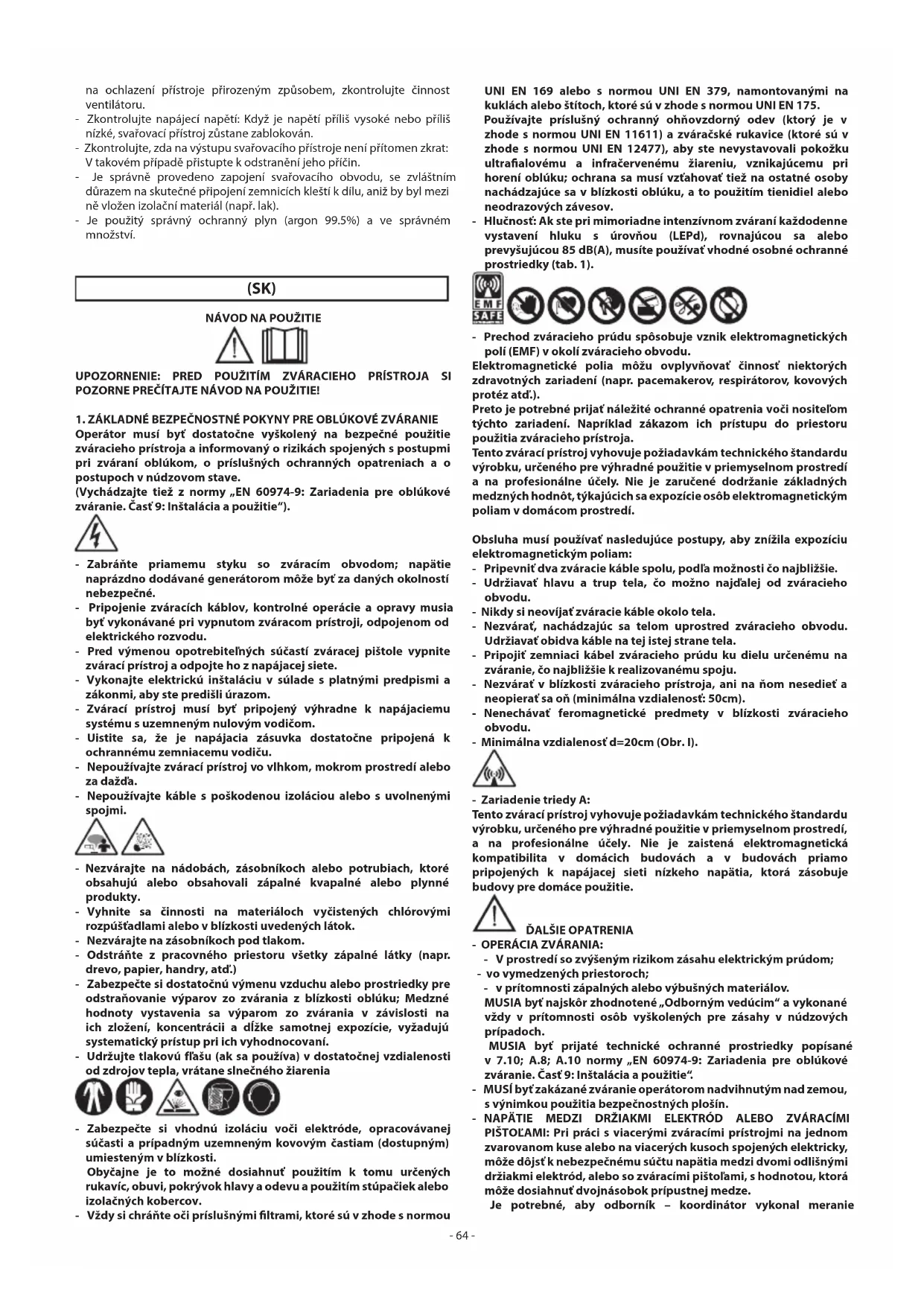 - OPERÁCIA ZVÁRANIA: - V prostredí so zvýšeným rizikom zásahu elektrickým prúdom; - vo vymedzených priestoroch; - v prítomnosti zápalných alebo výbušných materiálov. MUSIA byť najskôr zhodnotené „Odborným vedúcim“ a vykonané vždy v prítomnosti osôb vyškolených pre zásahy v núdzových prípadoch. MUSIA byť prijaté technické ochranné prostriedky popísané v 7.10; A.8; A.10 normy „EN 60974-9: Zariadenia pre oblúkové zváranie. Časť 9: Inštalácia a použitie“. - MUSÍ byť zakázané zváranie operátorom nadvihnutým nad zemou, s výnimkou použitia bezpečnostných plošín. - NAPÄTIE MEDZI DRŽIAKMI ELEKTRÓD ALEBO ZVÁRACÍMI PIŠTOĽAMI: Pri práci s viacerými zváracími prístrojmi na jednom zvarovanom kuse alebo na viacerých kusoch spojených elektricky, môže dôjsť k nebezpečnému súčtu napätia medzi dvomi odlišnými držiakmi elektród, alebo so zváracími pištoľami, s hodnotou, ktorá môže dosiahnuť dvojnásobok prípustnej medze. Je potrebné, aby odborník – koordinátor vykonal meranie- 65 - prístrojmi, aby tak stanovil riziko nebezpečenstva a mohol prijať vhodné ochranné opatrenia v súlade s ustanovením časti 7.9 normy „EN 60974-9: Zariadenia pre oblúkové zváranie. Časť 9: Inštalácia a použitie“. ZBYTKOVÉ RIZIKÁ - NESPRÁVNE POUŽITIE: Použitie zváracieho prístroja na akejkoľvek iné použitie než je správne použitie (napr. rozmrazovanie potrubia vodovodného rozvodu), je nebezpečné. - Je zakázané vešať zvárací prístroj za rukoväť.