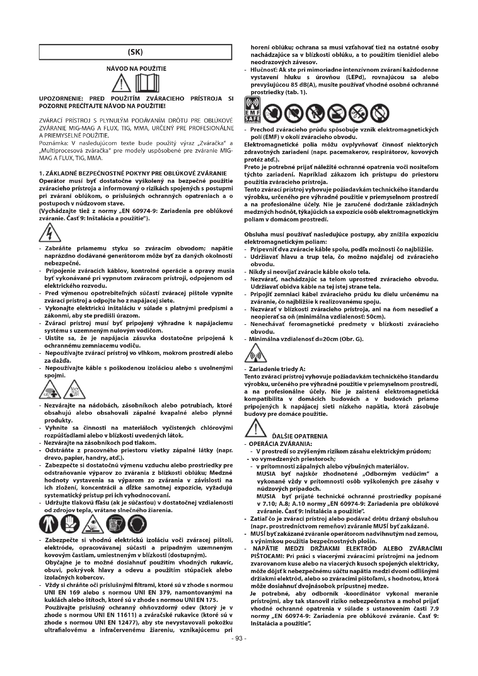 je uvedený v kapitole 1 „Základná bezpečnosť pre oblúkové zváranie“. Poznámka: Uvedený príklad štítku má iba indikatívny charakter poukazujúci na symboly a orientačné hodnoty; presné hodnoty technických údajov vášho zváracieho prístroja musia byť odčítané priamo z identikačného štítku samotného zváracieho prístroja. ĎALŠIE TECHNICKÉ PARAMETRE: - ZVÁRAČKA: viď tabuľka 1 (TAB. 1). - ZVÁRACIA PIŠTOĽ MIG: viď tabuľka 2 (TAB. 2). - ZVÁRACIA PIŠTOĽ TIG: viď tabuľka 3 (TAB. 3). - DRŽIAK ELEKTRÓDY: viď tabuľka 4 (TAB. 4). Hmotnosť zváračky je uvedená vtabuľke 1 (TAB. 1).