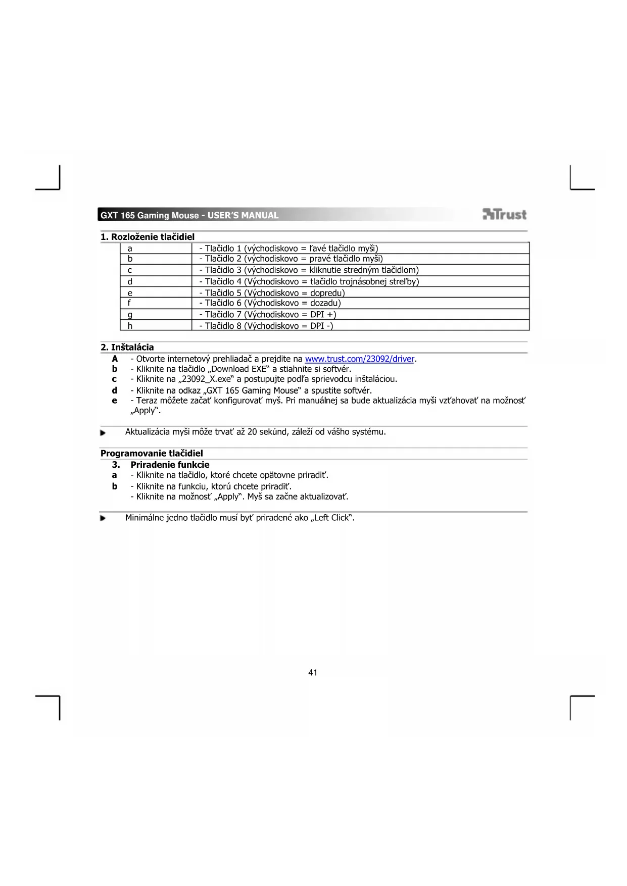 - Otvorte internetový prehliadač a prejdite na www.trust.com/23092/driver. - Kliknite na tlačidlo „Download EXE“ a stiahnite si softvér. - Kliknite na „23092_X.exe“ a postupujte podľa sprievodcu inštaláciou. - Kliknite na odkaz „GXT 165 Gaming Mouse“ a spustite softvér. - Teraz môžete začať konfigurovať myš. Pri manuálnej sa bude aktualizácia myši vzťahovať na možnosť „Apply“. Aktualizácia myši môže trvať až 20 sekúnd, záleží od vášho systému. Programovanie tlačidiel