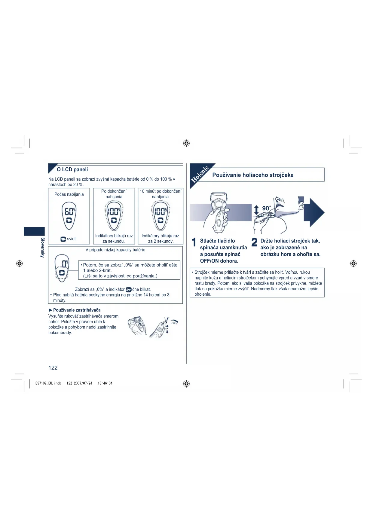 ES7109_EU.indb 121 2007/07/24 18:46:03122 Slovensky O LCD paneli Na LCD paneli sa zobrazí zvyšná kapacita batérie od 0 % do 100 % v nárastoch po 20 %. Počas nabíjania Po dokončení nabíjania 10 minút po dokončení nabíjania svieti. Indikátory blikajú raz za sekundu. Indikátory blikajú raz za 2 sekundy. V prípade nízkej kapacity batérie Potom, čo sa zobrzí „0%“ sa môžete oholiť ešte 1 alebo 2-krát. (Líši sa to v závislosti od používania.)
