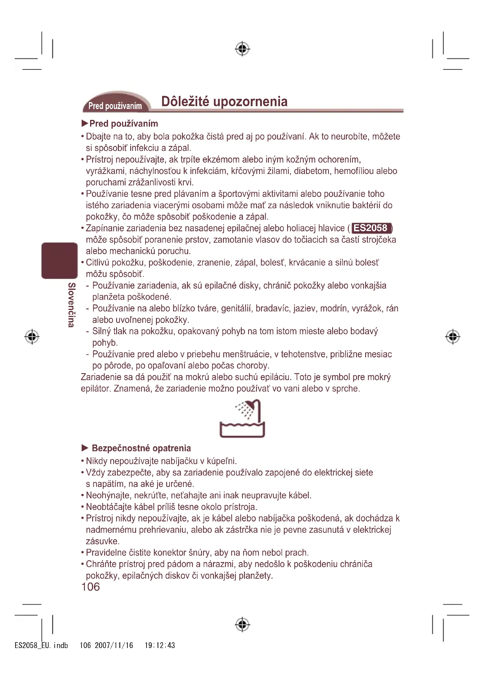 môže spôsobiť poranenie prstov, zamotanie vlasov do točiacich sa častí strojčeka alebo mechanickú poruchu. Citlivú pokožku, poškodenie, zranenie, zápal, bolesť, krvácanie a silnú bolesť môžu spôsobiť. Používanie zariadenia, ak sú epilačné disky, chránič pokožky alebo vonkajšia planžeta poškodené. Používanie na alebo blízko tváre, genitálií, bradavíc, jaziev, modrín, vyrážok, rán alebo uvoľnenej pokožky. Silný tlak na pokožku, opakovaný pohyb na tom istom mieste alebo bodavý pohyb. Používanie pred alebo v priebehu menštruácie, v tehotenstve, približne mesiac po pôrode, po opaľovaní alebo počas choroby. Zariadenie sa dá použiť na mokrú alebo suchú epiláciu. Toto je symbol pre mokrý epilátor. Znamená, že zariadenie možno používať vo vani alebo v sprche. Bezpečnostné opatrenia Nikdy nepoužívajte nabíjačku v kúpeľni. Vždy zabezpečte, aby sa zariadenie používalo zapojené do elektrickej siete s napätím, na aké je určené. Neohýnajte, nekrúťte, neťahajte ani inak neupravujte kábel. Neobtáčajte kábel príliš tesne okolo prístroja. Prístroj nikdy nepoužívajte, ak je kábel alebo nabíjačka poškodená, ak dochádza k nadmernému prehrievaniu, alebo ak zástrčka nie je pevne zasunutá v elektrickej zásuvke. Pravidelne čistite konektor šnúry, aby na ňom nebol prach. Chráňte prístroj pred pádom a nárazmi, aby nedošlo k poškodeniu chrániča pokožky, epilačných diskov či vonkajšej planžety.