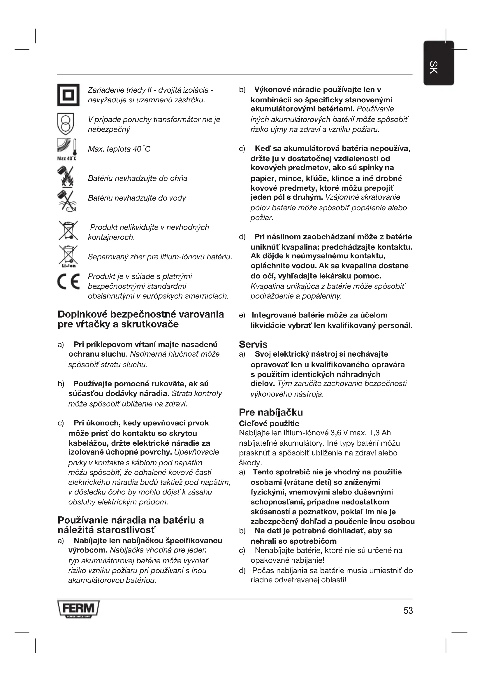 Batériu nevhadzujte do ohňa Batériu nevhadzujte do vody Produkt nelikvidujte v nevhodných kontajneroch. Separovaný zber pre lítium-iónovú batériu. Produkt je v súlade s platnými bezpečnostnými štandardmi obsiahnutými v európskych smerniciach. Doplnkové bezpečnostné varovania pre vŕtačky a skrutkovače a) Pri príklepovom vŕtaní majte nasadenú ochranu sluchu. Nadmerná hlučnosť môže spôsobiť stratu sluchu. b) Používajte pomocné rukoväte, ak sú súčasťou dodávky náradia. Strata kontroly môže spôsobiť ublíženie na zdraví. c) Pri úkonoch, kedy upevňovací prvok môže prísť do kontaktu so skrytou kabelážou, držte elektrické náradie za izolované úchopné povrchy. Upevňovacie prvky v kontakte s káblom pod napätím môžu spôsobiť, že odhalené kovové časti elektrického náradia budú taktiež pod napätím, v dôsledku čoho by mohlo dôjsť k zásahu obsluhy elektrickým prúdom. Používanie náradia na batériu a náležitá starostlivosť a) Nabíjajte len nabíjačkou špecikovanou výrobcom. Nabíjačka vhodná pre jeden typ akumulátorovej batérie môže vyvolať riziko vzniku požiaru pri používaní s inou akumulátorovou batériou. b) Výkonové náradie používajte len v kombinácii so špecicky stanovenými akumulátorovými batériami. Používanie iných akumulátorových batérií môže spôsobiť riziko ujmy na zdraví a vzniku požiaru. c) Keď sa akumulátorová batéria nepoužíva, držte ju v dostatočnej vzdialenosti od kovových predmetov, ako sú spinky na papier, mince, kľúče, klince a iné drobné kovové predmety, ktoré môžu prepojiť jeden pól s druhým. Vzájomné skratovanie pólov batérie môže spôsobiť popálenie alebo požiar. d) Pri násilnom zaobchádzaní môže z batérie uniknúť kvapalina; predchádzajte kontaktu. Ak dôjde k neúmyselnému kontaktu, opláchnite vodou. Ak sa kvapalina dostane do očí, vyhľadajte lekársku pomoc. Kvapalina unikajúca z batérie môže spôsobiť podráždenie a popáleniny. e) Integrované batérie môže za účelom likvidácie vybrať len kvalikovaný personál. Servis a) Svoj elektrický nástroj si nechávajte opravovať len u kvalikovaného opravára s použitím identických náhradných dielov. Tým zaručíte zachovanie bezpečnosti výkonového nástroja. Pre nabíjačku Cieľové použitie Nabíjajte len lítium-iónové 3,6 V max. 1,3 Ah nabíjateľné akumulátory. Iné typy batérií môžu prasknúť a spôsobiť ublíženie na zdraví alebo škody.