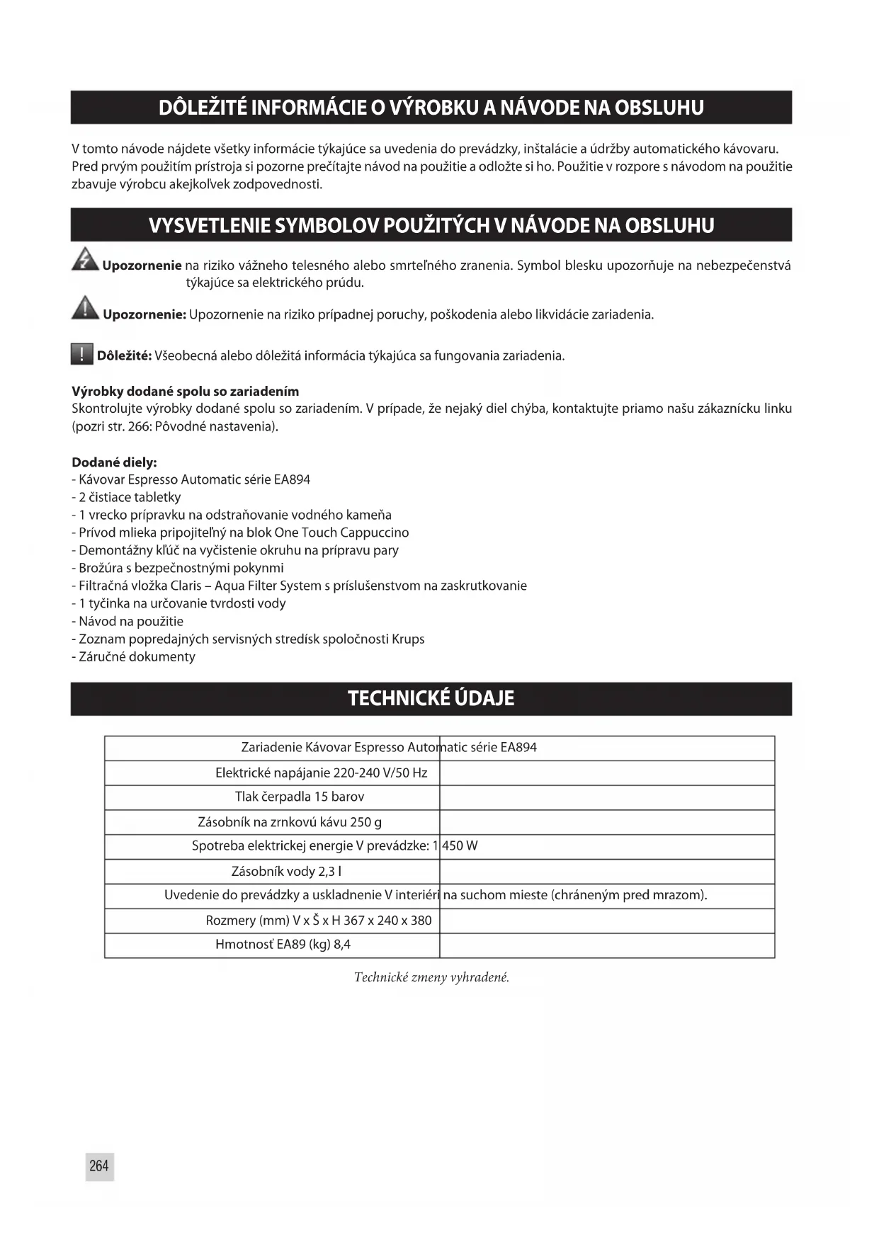 Dôležité: Všeobecná alebo dôležitá informácia týkajúca sa fungovania zariadenia. Výrobky dodané spolu so zariadením Skontrolujte výrobky dodané spolu so zariadením. V prípade, že nejaký diel chýba, kontaktujte priamo našu zákaznícku linku (pozri str. 266: Pôvodné nastavenia). Dodané diely: - Kávovar Espresso Automatic série EA894 - 2 čistiace tabletky - 1 vrecko prípravku na odstraňovanie vodného kameňa - Prívod mlieka pripojiteľný na blok One Touch Cappuccino - Demontážny kľúč na vyčistenie okruhu na prípravu pary - Brožúra s bezpečnostnými pokynmi - Filtračná vložka Claris – Aqua Filter System s príslušenstvom na zaskrutkovanie - 1 tyčinka na určovanie tvrdosti vody - Návod na použitie - Zoznam popredajných servisných stredísk spoločnosti Krups - Záručné dokumenty TECHNICKÉ ÚDAJE Zariadenie Kávovar Espresso Automatic série EA894 Elektrické napájanie 220-240 V/50 Hz Tlak čerpadla 15 barov Zásobník na zrnkovú kávu 250 g Spotreba elektrickej energie V prevádzke: 1 450 W Zásobník vody 2,3 l Uvedenie do prevádzky a uskladnenie V interiéri na suchom mieste (chráneným pred mrazom). Rozmery (mm) V x Š x H 367 x 240 x 380 Hmotnosť EA89 (kg) 8,4 Technické zmeny vyhradené. 264POPIS ZARIADENIA A Rukoväť nádržky na voduB Nádržka na voduC Nádoba na kávovú usadeninuD Výškovo nastaviteľné výstupy na kávuE Odnímateľná mriežka aodkvapkávacia nádobaF Veko zásobníka na zrnkovú kávuG Odnímateľný blok „One Touch Cappuccino“G1 Demontážny kľúč na čistenie parného okruhuG2 Jednodotykový blok cappuccinoH Hadička na mlieko azmiešavačI Plavák vodnej hladiny Zásobník na zrnkovú kávuJ Gombík pre nastavenie jemnosti zomletiaK Žliabok na čistiace tabletyL Mlynček s kovovým brúsnym ostrím Ovládací panelM OLED displejN Hlavný vypínačO Ovládacie tlačidláUpresňujúce informácie: Odkvapkávacia nádoba slúži na zber vody alebo kávy, ktorá môže vytiecť zo zariadenia počas apo príprave nápojov. Je dôležité ju vždy nechať na svojom mieste a pravidelne vyprázdňovať, keď to indikuje plavák.