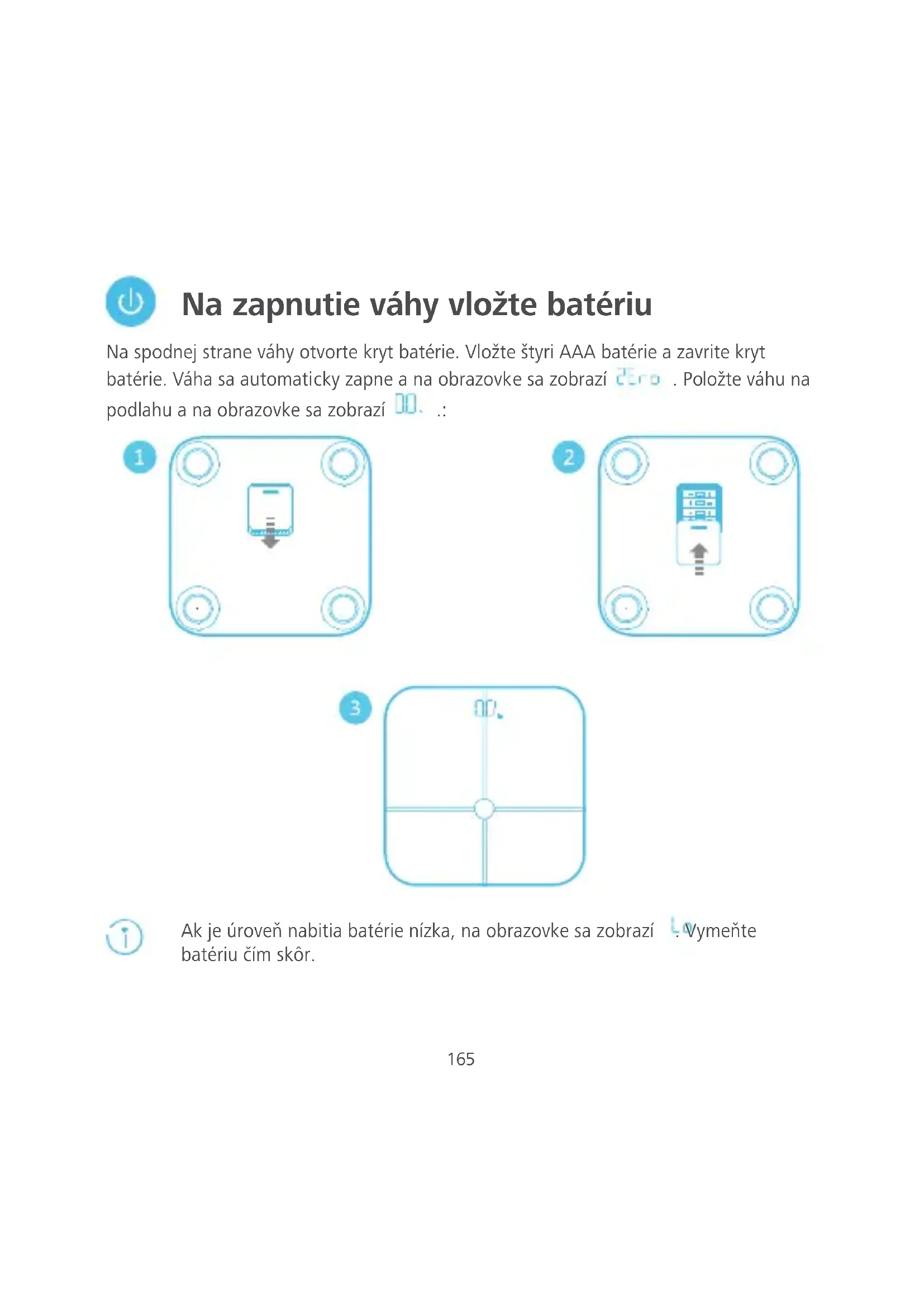 Aktivujte váhu Zľahka sa postavte na váhu jednou nohou. Obrazovka sa zapne, čo znamená že váha je aktívna.