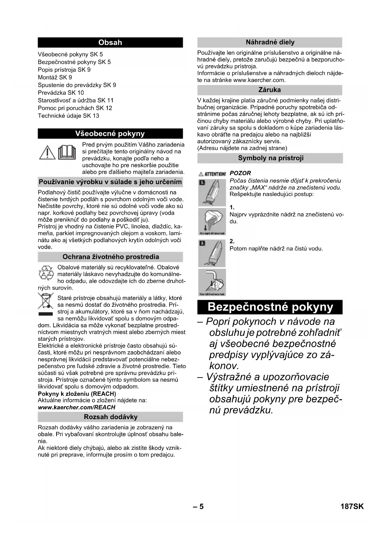 Tensiune de ieşire încărcător 30 V Intensitate de ieşire încărcător 0,6 A Caracteristicile de performanţă Rotaţii cilindri per minut 500 rot/min Cantitatea de umplere Rezervor de apă curată 400 ml Staţie de curăţare 200 ml Dimensiunile Greutate (fără accesorii şi soluţii de curăţat) 4,4 kg Lungime 320 mm Lăţime 270 mm Înălţime 1220 mm Lungimea cablului Încărcător 1500 mm 186 RO– 5 Pred prvým použitím Vášho zariadenia si prečítajte tento originálny návod na prevádzku, konajte podľa neho a uschovajte ho pre neskoršie použitie alebo pre ďalšieho majiteľa zariadenia. Podlahový čistič používajte výlučne v domácnosti na čistenie tvrdých podláh s povrchom odolným voči vode. Nečistite povrchy, ktoré nie sú odolné voči vode ako sú napr. korkové podlahy bez povrchovej úpravy (voda môže preniknúť do podlahy a poškodiť ju). Prístroj je vhodný na čistenie PVC, linolea, dlaždíc, ka- meňa, parkiet impregnovaných olejom a voskom, lami- nátu ako aj všetkých podlahových krytín odolných voči vode. Obalové materiály sú recyklovateľné. Obalové materiály láskavo nevyhadzujte do komunálne- ho odpadu, ale odovzdajte ich do zberne druhot- ných surovín. Staré prístroje obsahujú materiály a látky, ktoré sa nesmú dostať do životného prostredia. Prí- stroj a akumulátory, ktoré sa v ňom nachádzajú, sa nemôžu likvidovať spolu s domovým odpa- dom. Likvidácia sa môže vykonať bezplatne prostred- níctvom miestnych vratných miest alebo zberných miest starých prístrojov. Elektrické a elektronické prístroje často obsahujú sú- časti, ktoré môžu pri nesprávnom zaobchádzaní alebo nesprávnej likvidácii predstavovať potenciálne nebez- pečenstvo pre ľudské zdravie a životné prostredie. Tieto súčasti sú však potrebné pre správnu prevádzku prí- stroja. Prístroje označené týmto symbolom sa nesmú likvidovať spolu s domovým odpadom. Pokyny k zloženiu (REACH) Aktuálne informácie o zložení nájdete na: www.kaercher.com/REACH Rozsah dodávky vášho zariadenia je zobrazený na obale. Pri vybaľovaní skontrolujte úplnosť obsahu bale- nia. Ak niektoré diely chýbajú, alebo ak zistíte škody vznik- nuté pri preprave, informujte prosím o tom predajcu. Používajte len originálne príslušenstvo a originálne ná- hradné diely, pretože zaručujú bezpečnú a bezporucho- vú prevádzku prístroja. Informácie o príslušenstve a náhradných dieloch nájde- te na stránke www.kaercher.com. V každej krajine platia záručné podmienky našej distri- bučnej organizácie. Prípadné poruchy spotrebiča od- stránime počas záručnej lehoty bezplatne, ak sú ich prí- činou chyby materiálu alebo výrobné chyby. Pri uplatňo- vaní záruky sa spolu s dokladom o kúpe zariadenia lás- kavo obráťte na predajcu alebo na najbližší autorizovaný zákaznícky servis. (Adresu nájdete na zadnej strane) – Popri pokynoch v návode na obsluhu je potrebné zohľadniť aj všeobecné bezpečnostné predpisy vyplývajúce zo zá- konov. – Výstražné a upozorňovacie štítky umiestnené na prístroji obsahujú pokyny pre bezpeč- nú prevádzku. Obsah Všeobecné pokyny SK 5 Bezpečnostné pokyny SK 5 Popis prístroja SK 9 Montáž SK 9 Spustenie do prevádzky SK 9 Prevádzka SK 10 Starostlivosť a údržba SK 11 Pomoc pri poruchách SK 12 Technické údaje SK 13 Všeobecné pokyny Používanie výrobku v súlade s jeho určením Ochrana životného prostredia Rozsah dodávky Náhradné diely Záruka Symboly na prístroji POZOR Počas čistenia nesmie dôjsť k prekročeniu značky „MAX“ nádrže na znečistenú vodu. Rešpektujte nasledujúci postup: