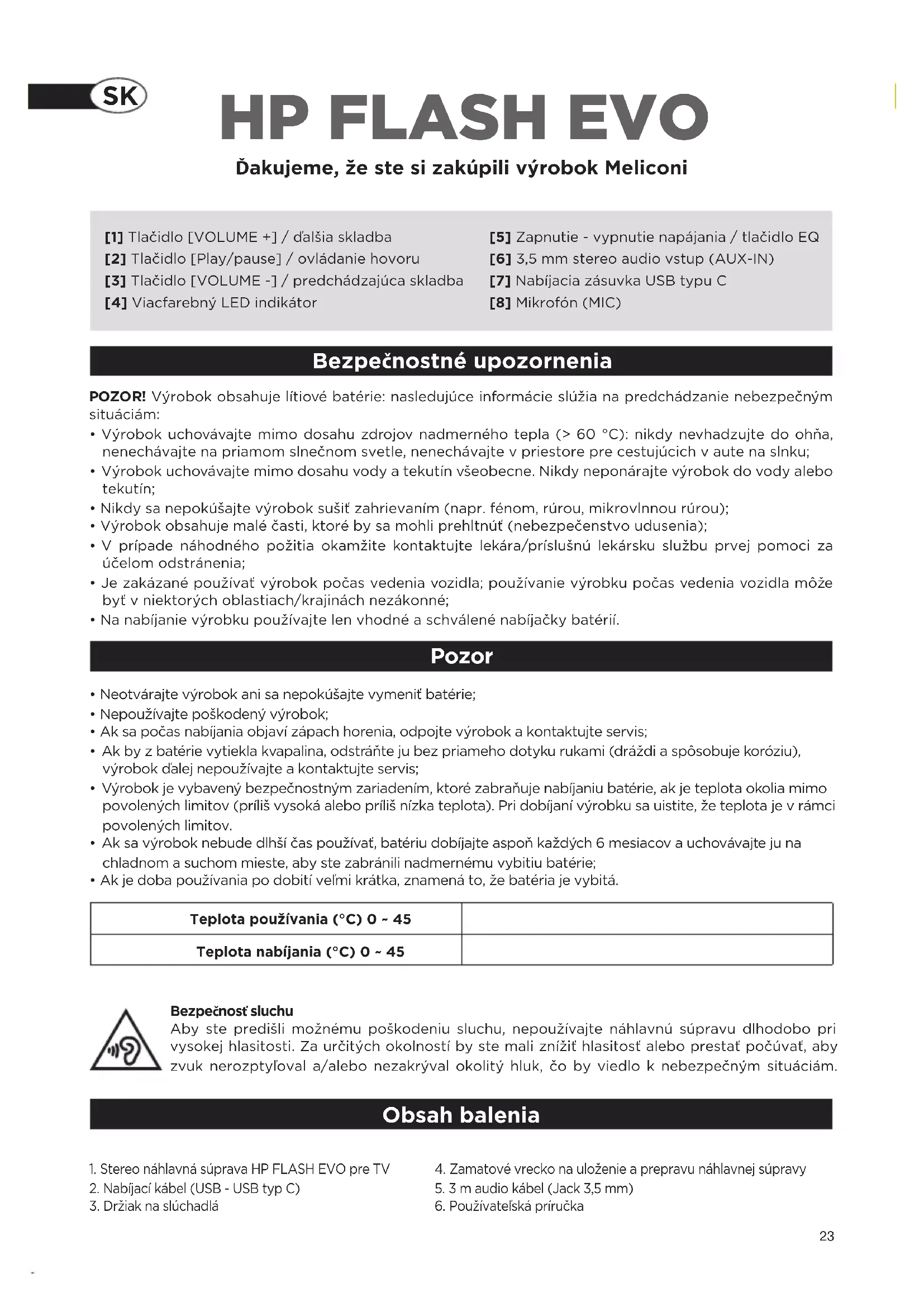 Obsah balenia [1] Tlačidlo [VOLUME +] / ďalšia skladba [2] Tlačidlo [Play/pause] / ovládanie hovoru [3] Tlačidlo [VOLUME -] / predchádzajúca skladba [4] Viacfarebný LED indikátor [5] Zapnutie - vypnutie napájania / tlačidlo EQ [6] 3,5 mm stereo audio vstup (AUX-IN) [7] Nabíjacia zásuvka USB typu C [8] Mikrofón (MIC) Bezpečnosť sluchu Aby ste predišli možnému poškodeniu sluchu, nepoužívajte náhlavnú súpravu dlhodobo pri vysokej hlasitosti. Za určitých okolností by ste mali znížiť hlasitosť alebo prestať počúvať, aby zvuk nerozptyľoval a/alebo nezakrýval okolitý hluk, čo by viedlo k nebezpečným situáciám. Teplota používania (°C) 0 ~ 45 Teplota nabíjania (°C) 0 ~ 45