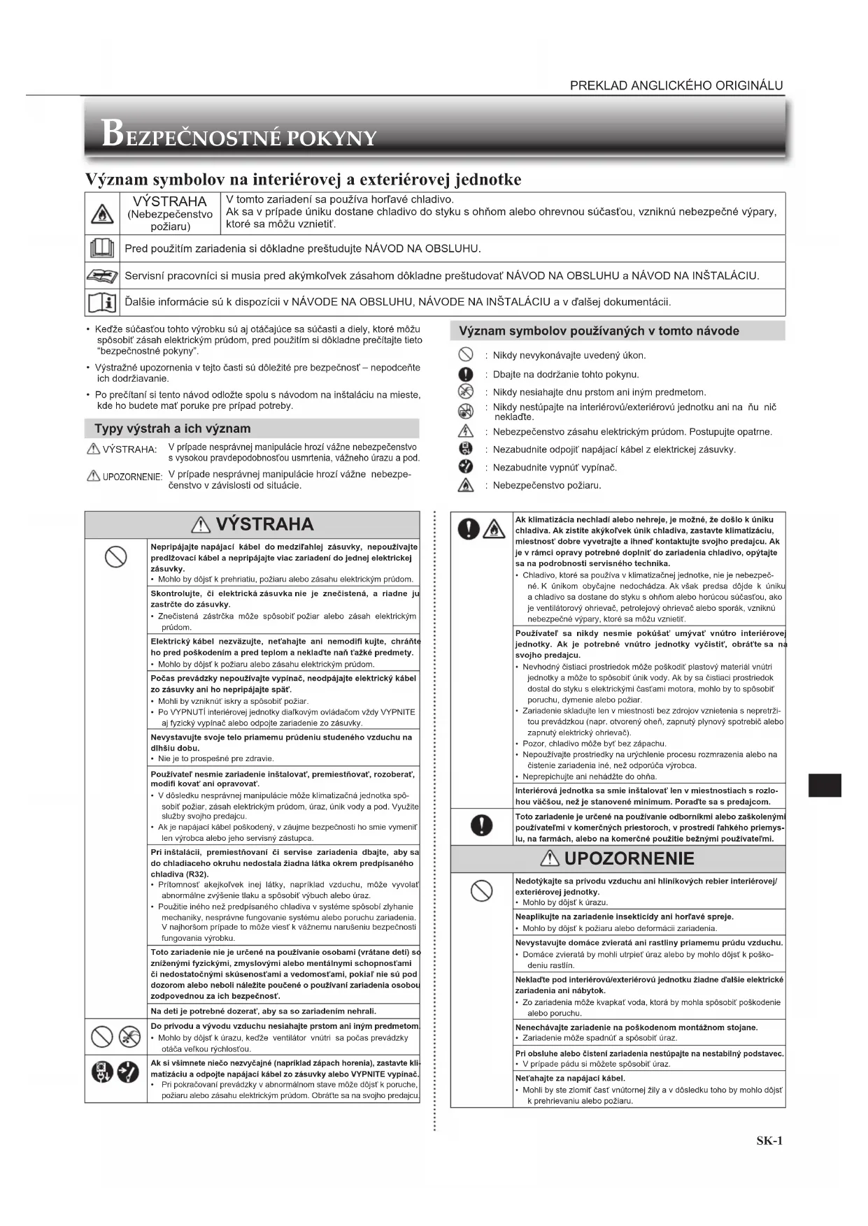SK SK• Keďže súčasťou tohto výrobku sú aj otáčajúce sa súčasti a diely, ktoré môžu spôsobiť zásah elektrickým prúdom, pred použitím si dôkladne prečítajte tieto “bezpečnostné pokyny”.• Výstražné upozornenia v tejto časti sú dôležité pre bezpečnosť – nepodceňte ich dodržiavanie.• Po prečítaní si tento návod odložte spolu s návodom na inštaláciu na mieste, kde ho budete mať poruke pre prípad potreby. Typy výstrah a ich význam VÝSTRAHA:V prípade nesprávnej manipulácie hrozí vážne nebezpečenstvo s vysokou pravdepodobnosťou usmrtenia, vážneho úrazu a pod. UPOZORNENIE:V prípade nesprávnej manipulácie hrozí vážne nebezpe-čenstvo v závislosti od situácie. Význam symbolov používaných v tomto návode : Nikdy nevykonávajte uvedený úkon. : Dbajte na dodržanie tohto pokynu. : Nikdy nesiahajte dnu prstom ani iným predmetom. : Nikdy nestúpajte na interiérovú/exteriérovú jednotku ani na ňu nič neklaďte. : Nebezpečenstvo zásahu elektrickým prúdom. Postupujte opatrne. : Nezabudnite odpojiť napájací kábel z elektrickej zásuvky. : Nezabudnite vypnúť vypínač. : Nebezpečenstvo požiaru.