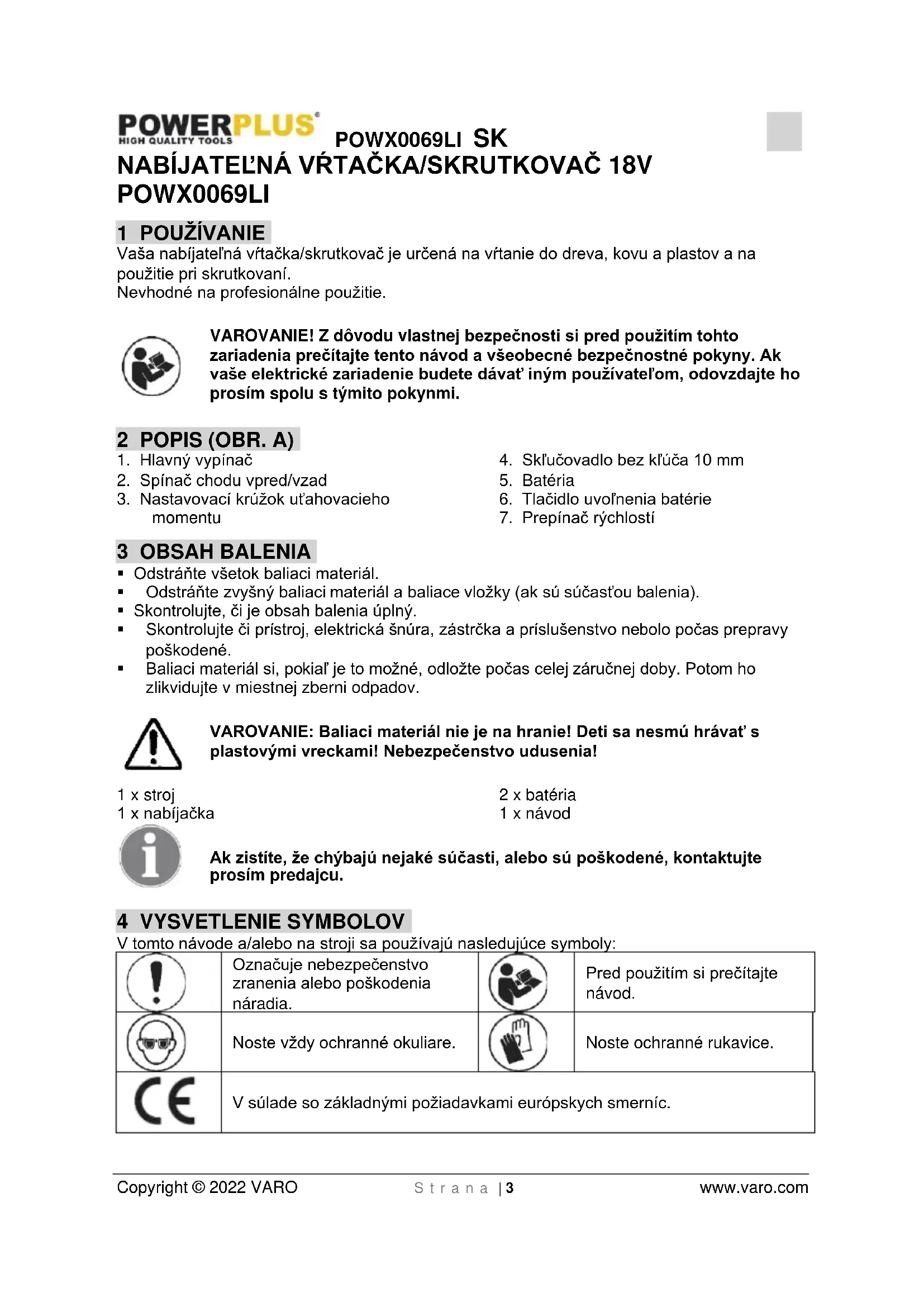 V súlade so základnými požiadavkami európskych smerníc.POWX0069LI SK Copyright © 2022 VARO S t r a n a | 4 www.varo.com 5 VŠEOBECNÉ BEZPEČNOSTNÉ VAROVANIA PRE ELEKTRICKÉ NÁRADIE Starostlivo si prečítajte všetky bezpečnostné varovania a všetky pokyny. Nedodržiavanie všetkých varovaní a pokynov môže spôsobiť úder elektrickým prúdom, požiar a/alebo závažný úraz. Odložte si všetky varovania a pokyny na prípad, ak ich budete v budúcnosti potrebovať. Termín "elektrické náradie" v týchto varovaniach označuje vaše elektrické náradie s napájaním zo siete (s káblom) alebo elektrické náradie napájané akumulátorom (bez kábla).