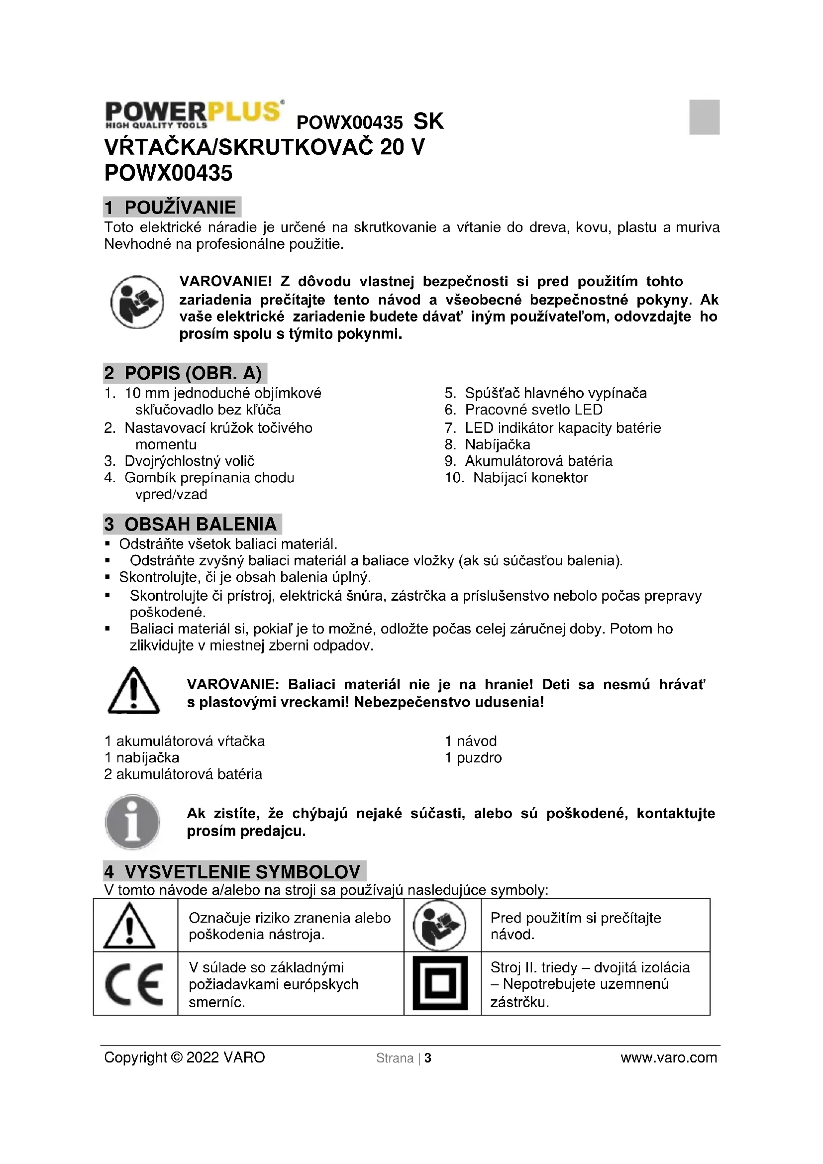 - Servis elektrického náradia zverte kvalifikovanému opravárovi. Môžu sa používať iba rovnaké náhradné diely. Zaručíte tak, že bude zachovaná bezpečnosť elektrického náradia.POWX00435 SK Copyright © 2022 VARO Strana | 6 www.varo.com 6 DOPLNKOVÉ BEZPEČNOSTNÉ POKYNY PRE BATÉRIE A